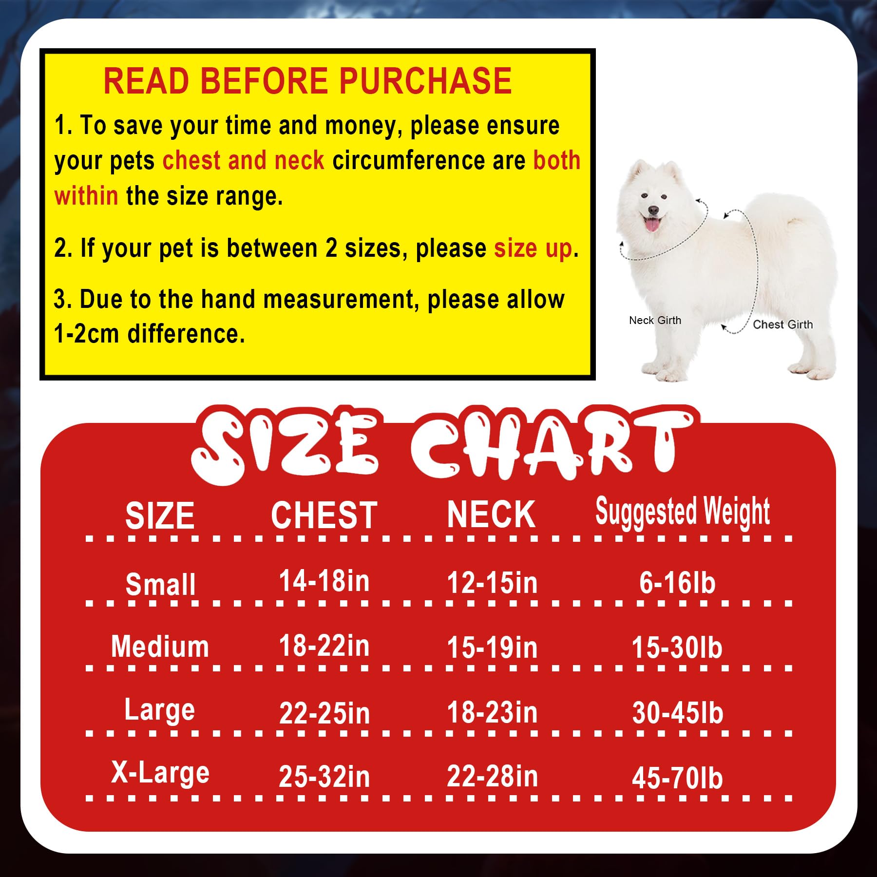 • Multiple Sizes: This set of Halloween costumes for dogs are designed in 4 sizes, suitable for all breed sizes dogs and other pets. You can adjust the neck and chest by tying the elastic ropes to fit your pets better.To save your time and money, please refer to the size chart before ordering.