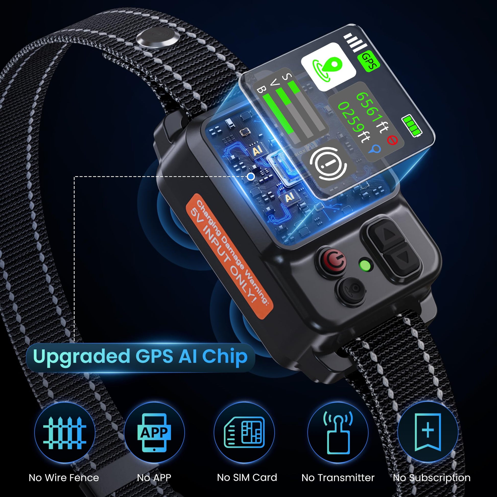 • 【Next-Gen GPS Wireless Fence】Our GPS wireless dog fence adopts the latest 'AI algorithm GPS technology', which has advanced anti-interference ability, ultra-high sensitivity, and intelligent identification talent, accurately recognizes your dog's real-time position, then trains your dog's behavior of not crossing the wireless fence, ensure your dog staying in the designated safe zone.