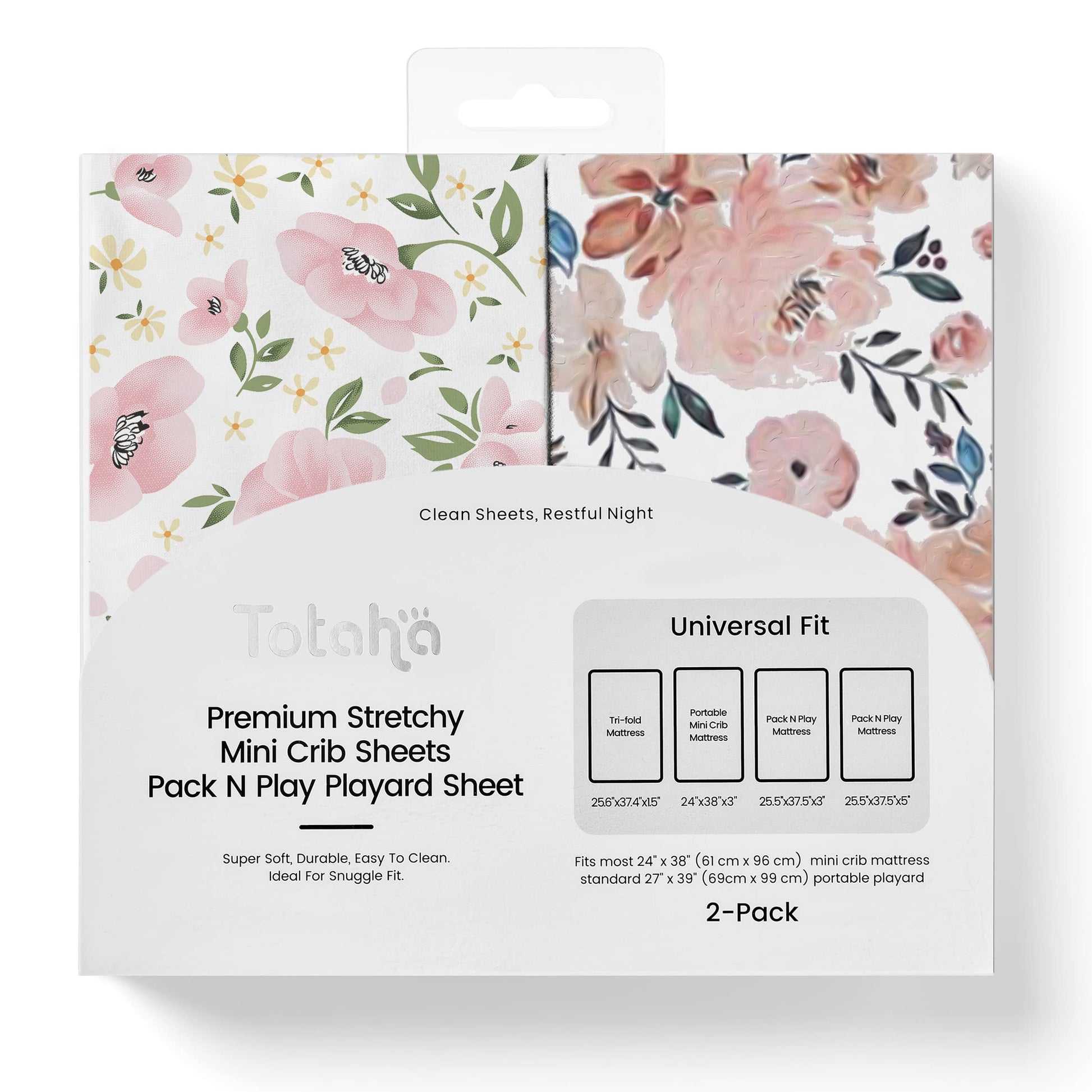Graco Pack and Play Sheets Fitted, TotAha Buttery Soft Mini Crib Sheets Girl, Floral Pack N Play Mattress Sheets Hypoallergenic, Premium Jersey Playrad Sheets, Meredith Allover & Pale Pink, 2 Pack