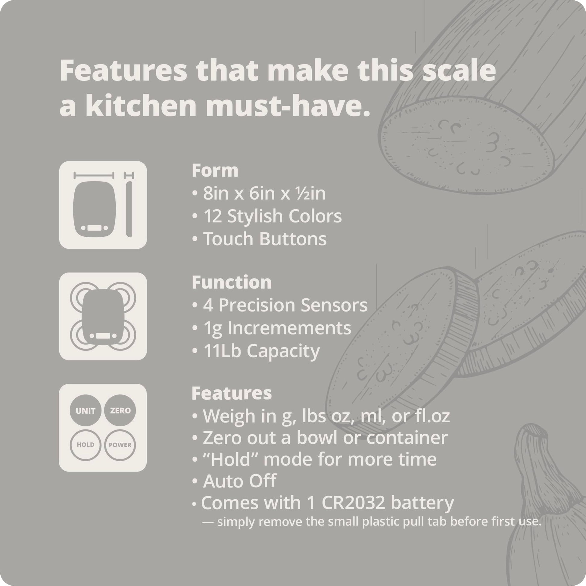 • Compact Digital Kitchen Scale – No Extra Fuss: An affordable, low-profile food scale for everyday cooking and baking. At just 8'x6'x0.5', this small digital kitchen scale fits neatly in drawers and looks sleek on countertops.