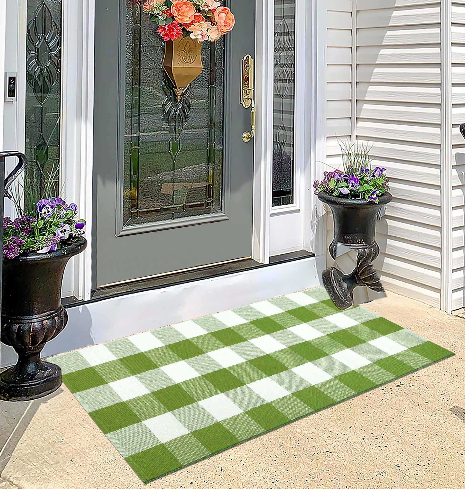 Green and White Buffalo Outdoor Rug 24''x51''Checkered Plaid Front Porch Rug Cotton Woven Machine Washable Door Mat Outdoor for Layered Doormat Hello Welcome Door Mat Kitchen Farmhouse Entryway