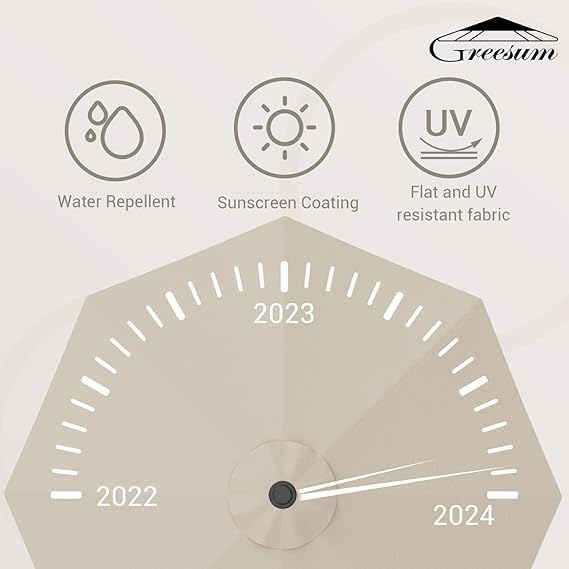 Details: Greesum 9FT Patio Umbrella with Push Button Tilt and Crank, Outdoor Table Umbrella with 8 Sturdy Ribs, Market Table Parasol for Garden, Lawn, Backyard & Pool, Without Base, Beige