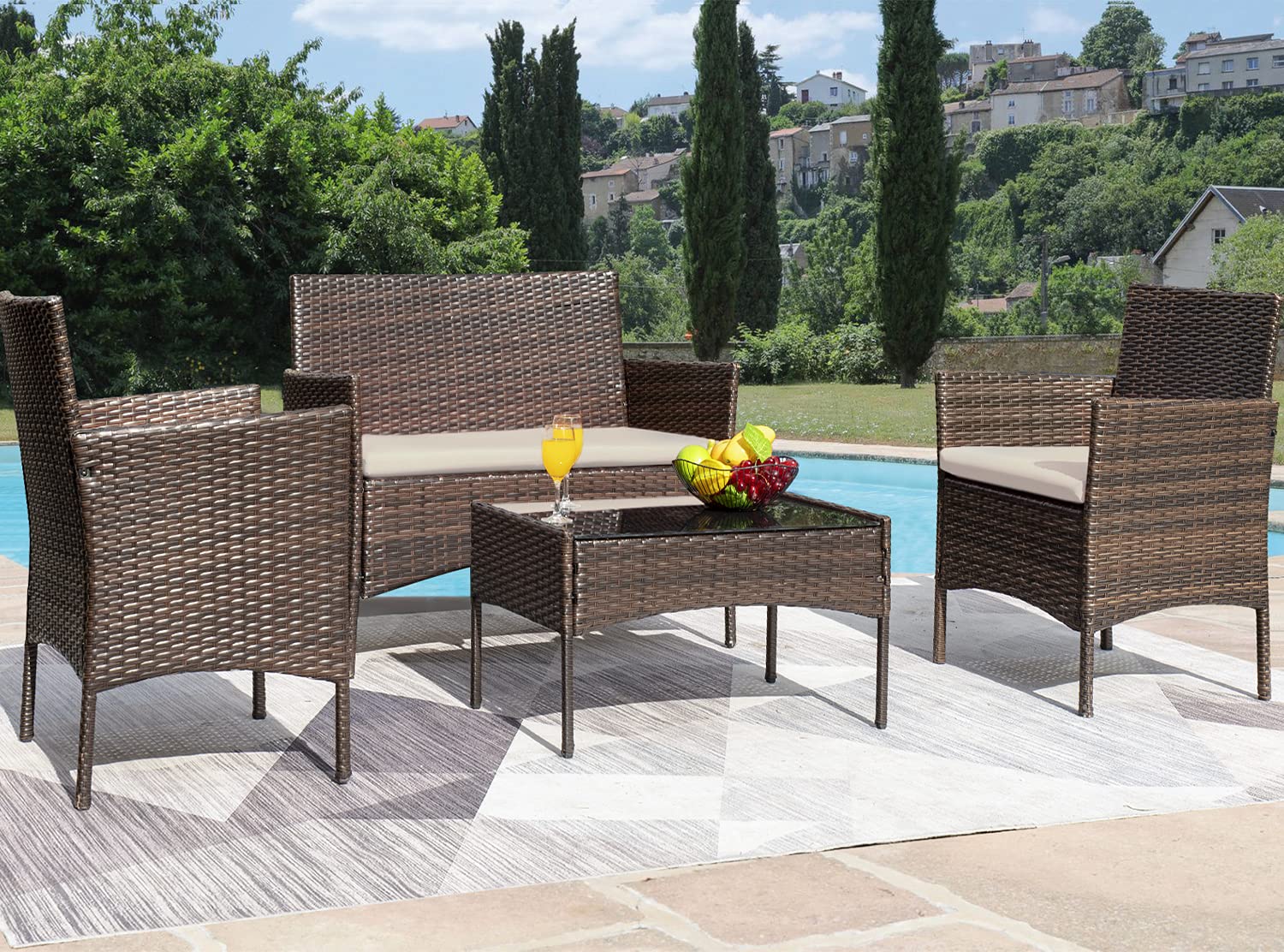 Details: Greesum 4 Pieces Patio Furniture Sets Feature: Easy to assemble and move Modern design for your modern life Soft cushions can make you feel comfortable when you sit on it Excellent manufacture technology make the chairs looks very smooth and fashion Anti rust and anti-corrosion treatment make the chair has longer service life Rattan wicker has outstanding sturdy to stand your weight and the material looks like very smooth It can be widely used in differnt scenarios such as can use it to have a nice chat with your firends in your beautiful garden Specification: Color: Brown and Beige Material: Rattan wicker and glass Dimension of table: 28.1' x 16.1' x 15.4' Dimension of love seat: 35' x 20.7' x 25' Dimension of single seat: 18.1' x 18.1' x 34.1' Package Dimensions: 37.5'(L) x 11.3'(W) x 25.8'(H) Weight:48.51lbs Package includes: A tool kit Beige cushions A love seat Two single chairs A glass coffee table A manual of installation and usage Notice: There may be some differences between the photos and products in terms of color due to the influence of the lighting during the process of shooting