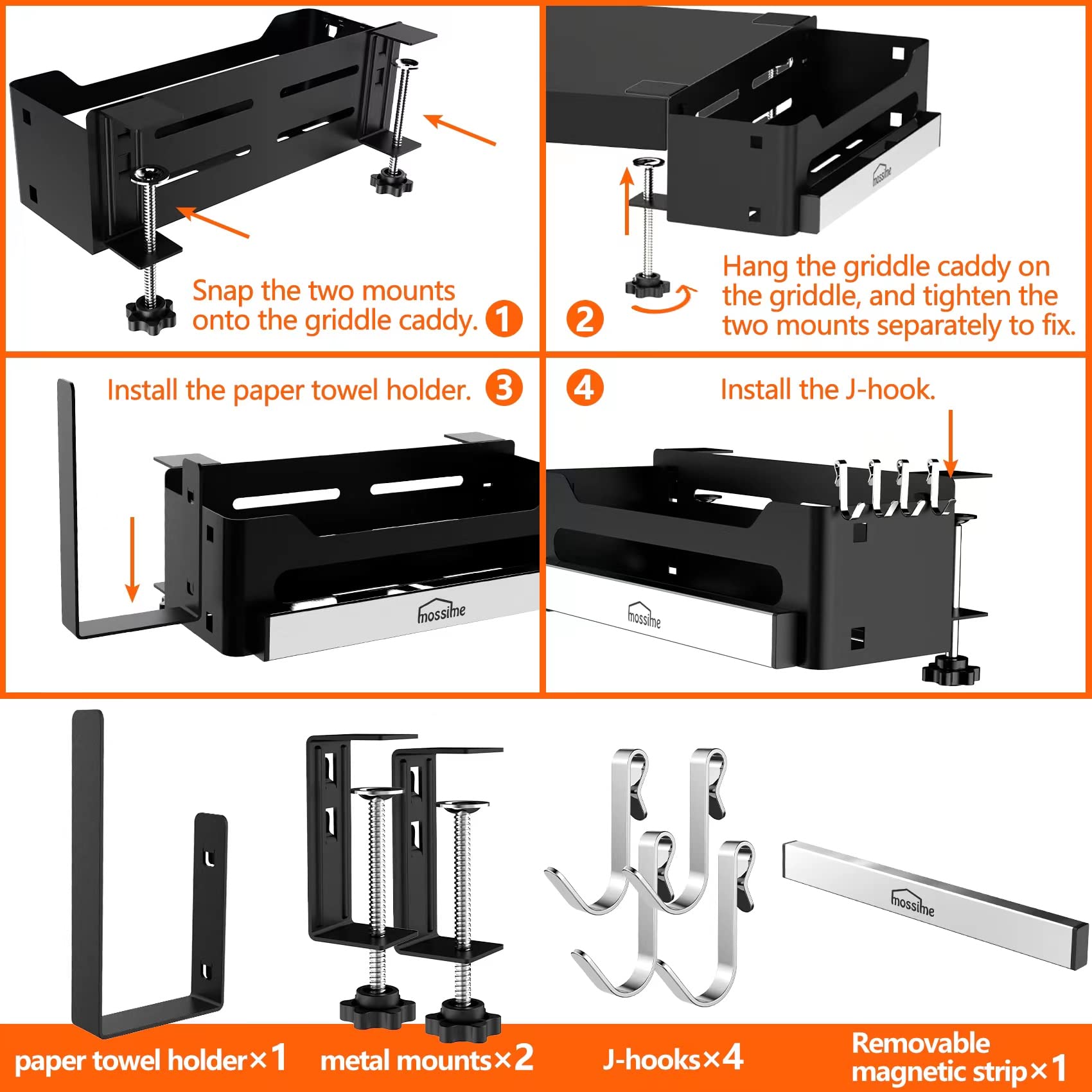 • 【Effortless Installation】First of all, only need install the mounting clamps on your Blackstone griddle's side shelf by hand, then twist and tighten the 2 metal mounts and hang the grill caddy, secondly, mounting the magnetic bbq contact tool holder and J-hooks . The whole process only takes 2 minutes. Place your barbecue tools safely, save space, and be efficient and tidy. Better absorb and hold your griddle accessories so that they won't fall off easily.