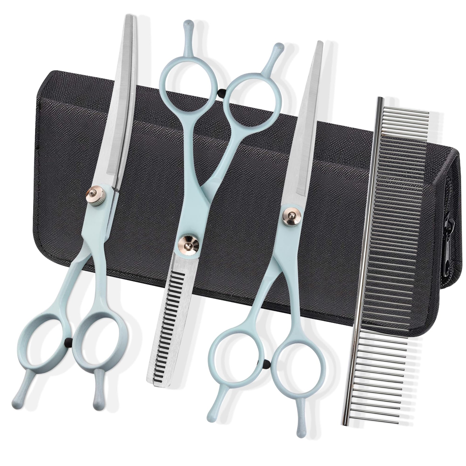 • 5 IN 1 DOG GROOMING SCISSORS KIT: The dog grooming scissors set comes with 1 x 7 Inches Straight Hair Scissors, 1 x 7 Inches Curved Scissors, 1 x 6 Inches Thinning Shears, 1 x Grooming Comb, 1 x Storage Case. This all-in-one grooming kit meet all your pet hair cutting and styling needs.