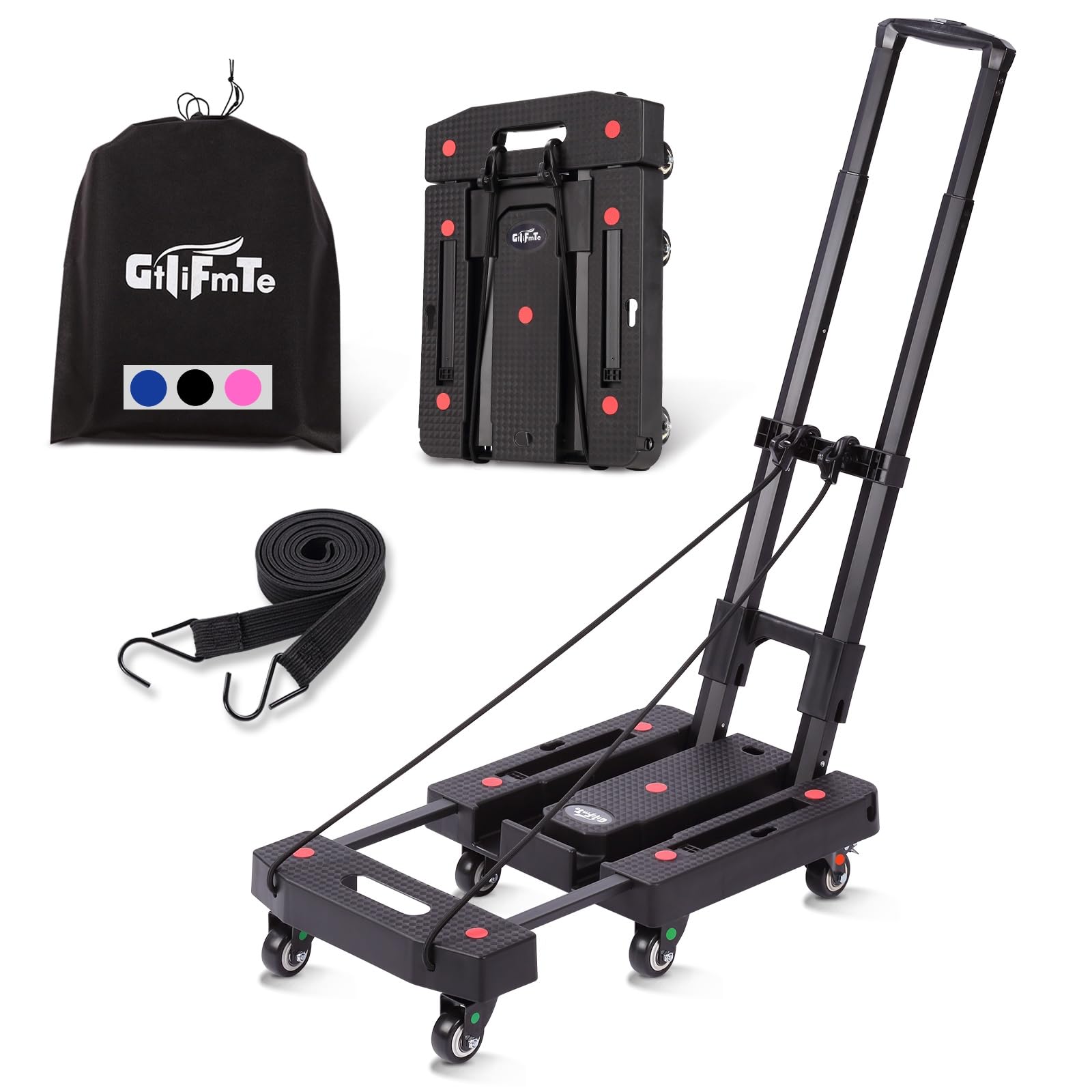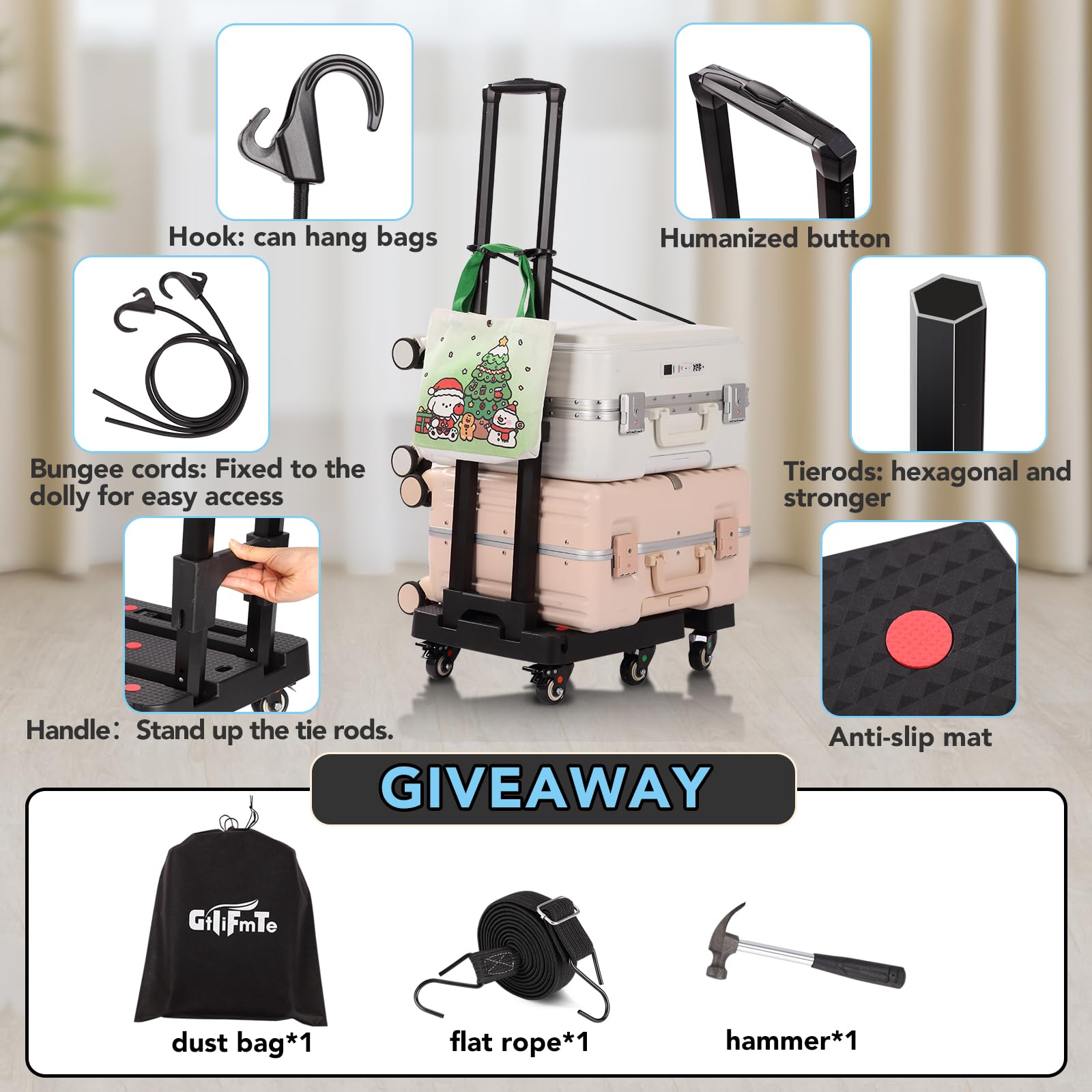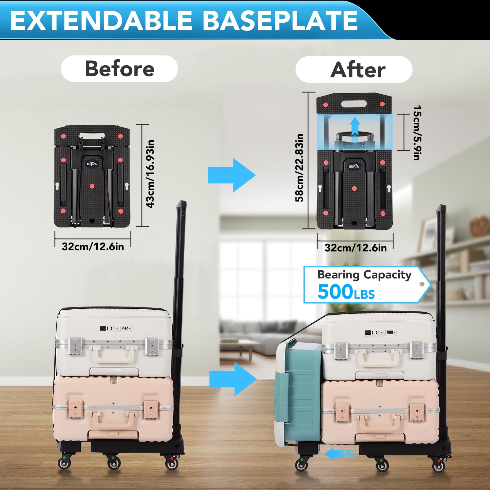 GtIiFmTe Folding Hand Truck Dolly for Moving,500LB Heavy DutyPortable Luggage Cart6 Wheels with 2 Brake,Extendable Utility Dolly Platform Cart with 3 Bungee Cords (Black)