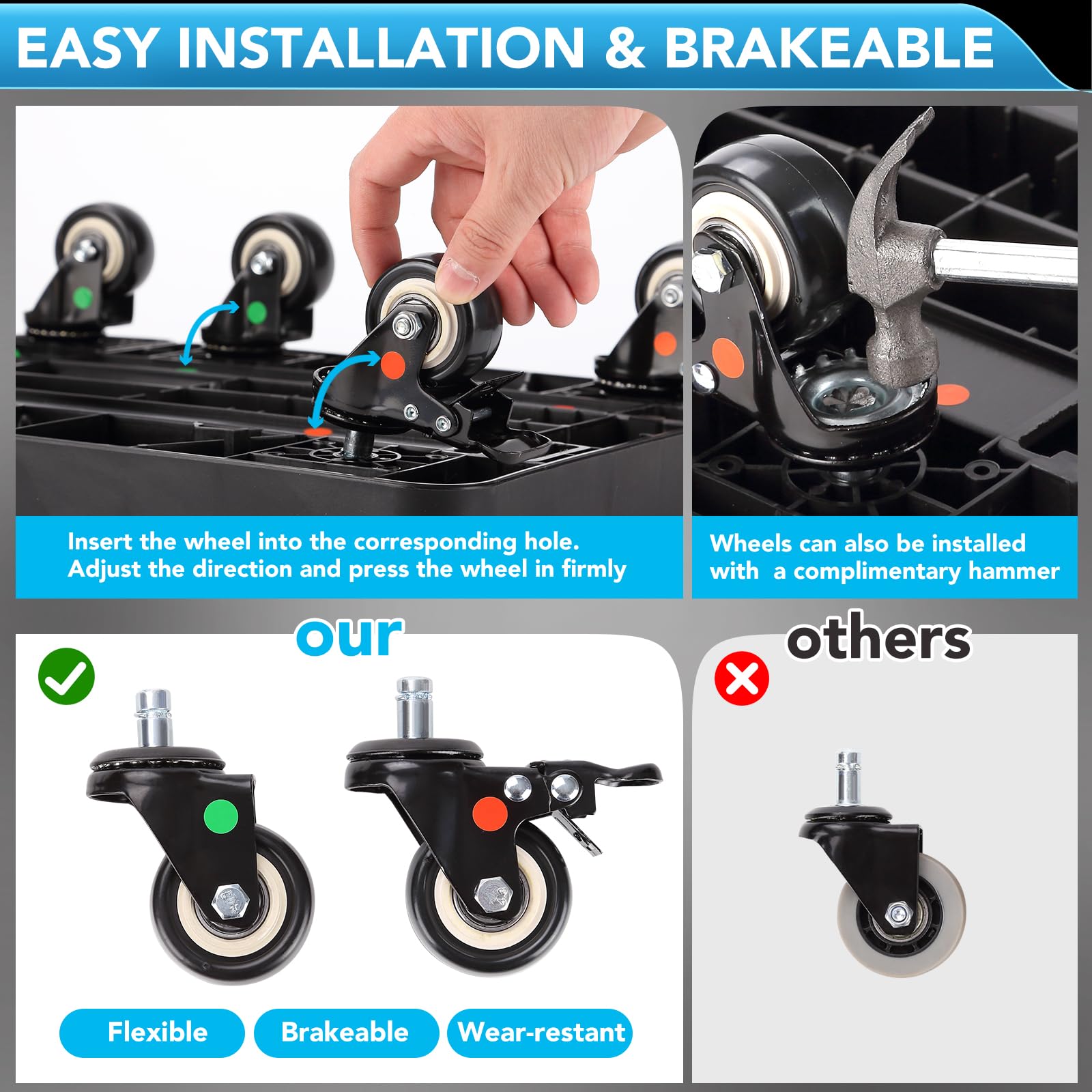 • BRAKE WHEEL:This upgraded folding hand truck is equipped with 6 pcs removable wheels:2* 360°brake wheels and 4 *360°rorate wheels. Quiet and wear-resistant wheels greatly improve the folding cart's agility and stability.The brake wheels ensure the folding dolly does not slip during loading and unloading,Stay still even on30°slopes.Not suitable for stairs!