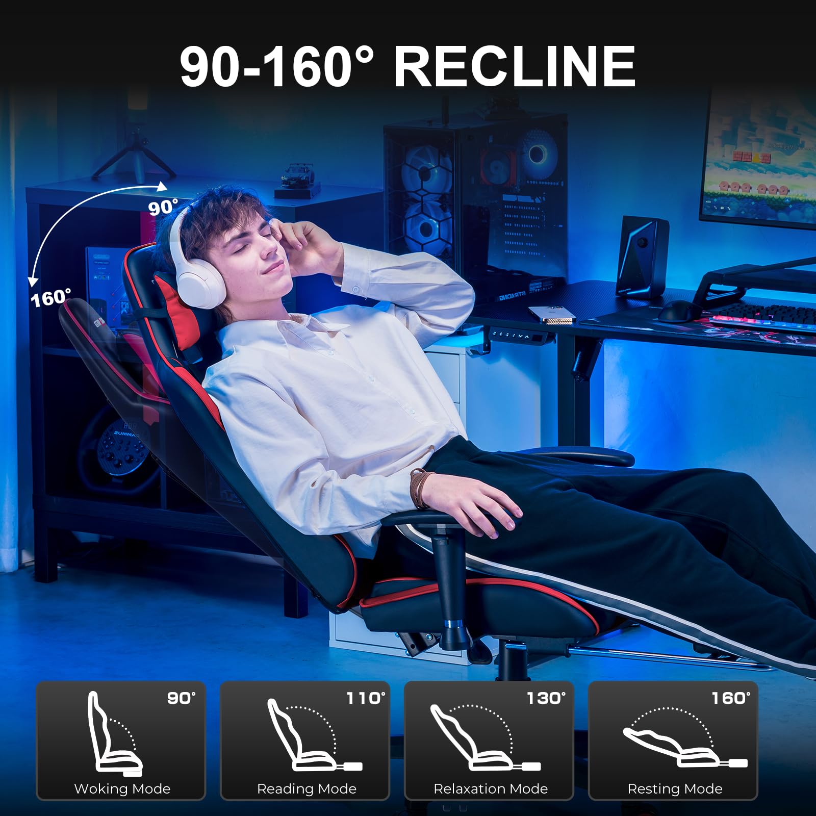 • Modular Footrest for Hybrid Gaming & Relaxation: Retractable footrest seamlessly integrates with the gaming chair base, offering quick deployment for racing simulation immersion or casual reclining during movie nights, all while maintaining compact workstation dimensions.