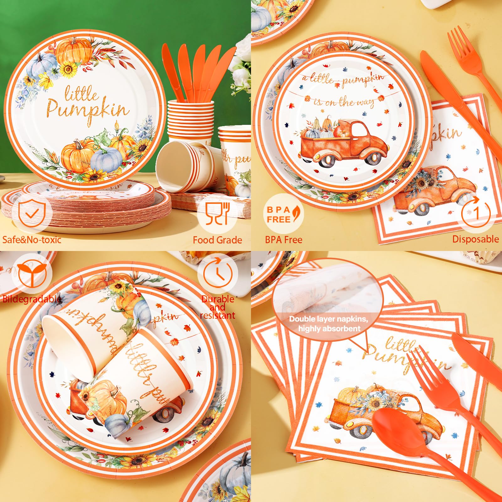 Gudvilla 168 Pcs Little Pumpkin Plates and Napkins, Fall Baby Shower Plates and Napkins Sets Serves 24, Little Pumpkin Baby Shower Decorations Boy, Orange Blue Autumn Farm Thanksgiving