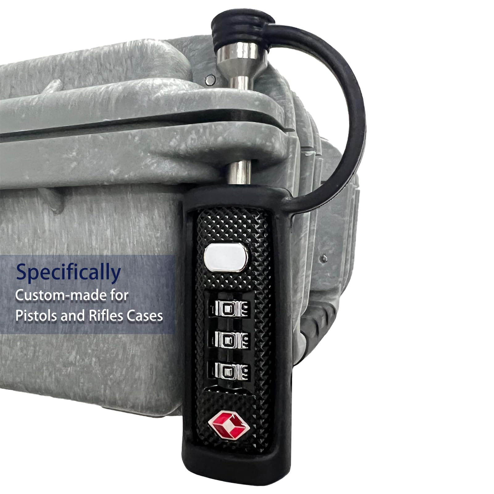 • 1. Hard pistol cases lock size 3.9”x 0.95”x 1.05”inches. Compliant with TSA Key (KEY NOT INCLUDED). The hard pistol cases firearm lock pin is 1.05'(L)x0.23'(W). Our TSA approved hard gun case locks are made from high quality alloy, have a protective rubber sleeve and a heavy duty cut resistant single shaft exterior that is durable enough to take a huge beating. Whether you use the combo gun case lock indoor, or travel, rest assured that these gun case padlocks will deter any opportunistic thief.