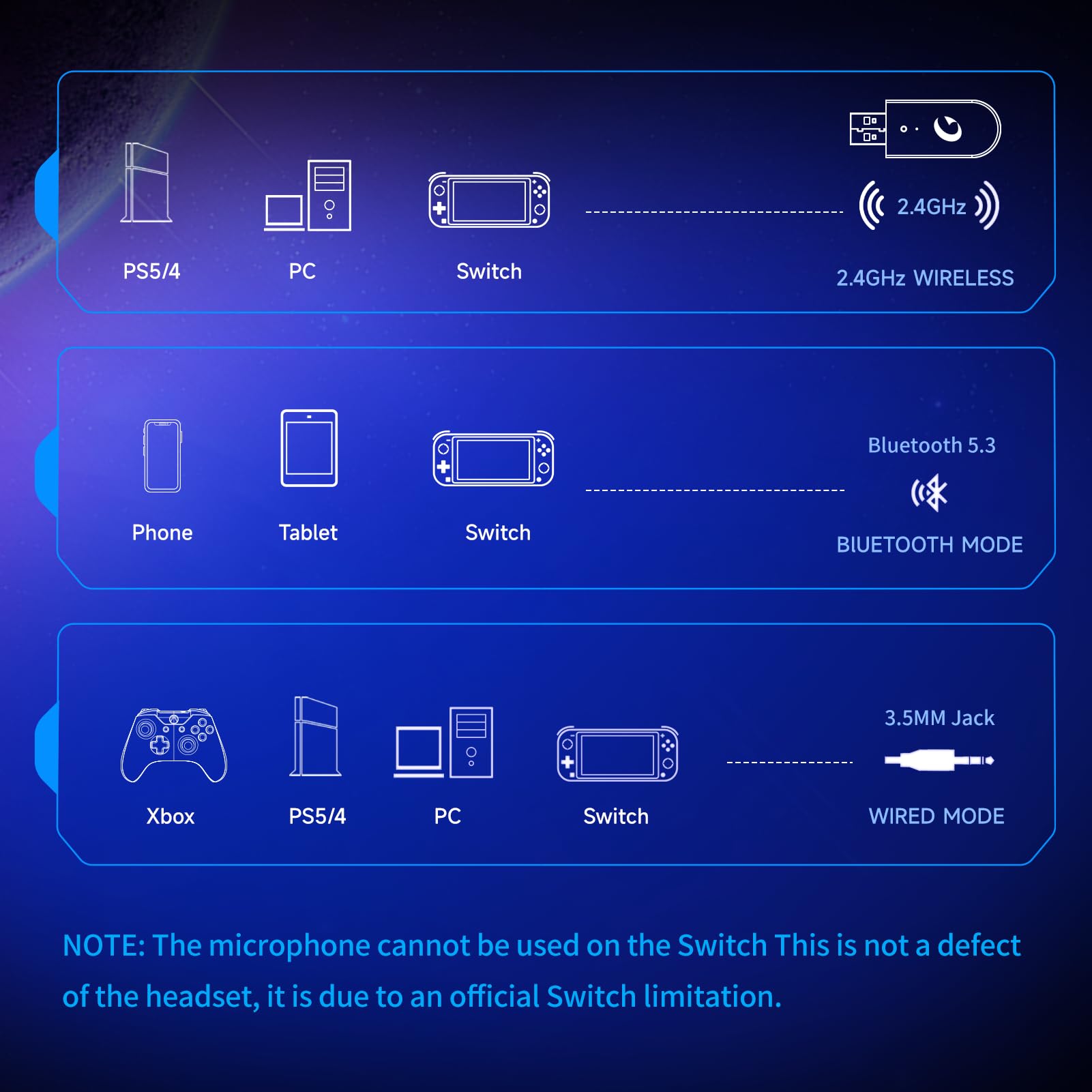 • 🎧 Versatile Connectivity & Wide Compatibility: Enjoy the convenience of multiple connection options with our wireless gaming headset. It supports low-latency, lossless 2.4GHz USB dongle (Delay≤20ms ) & latest Bluetooth 5.3 stable connection, and a 3.5mm wired jack mode. Unique 3 in 1 connection design makes this gaming headset compatible with various platforms, including PS5, PS4 controller, PC, Mac, Nintendo Switch(Invalid Microphone), pad, while Xbox series is compatible ONLY in wired mode.