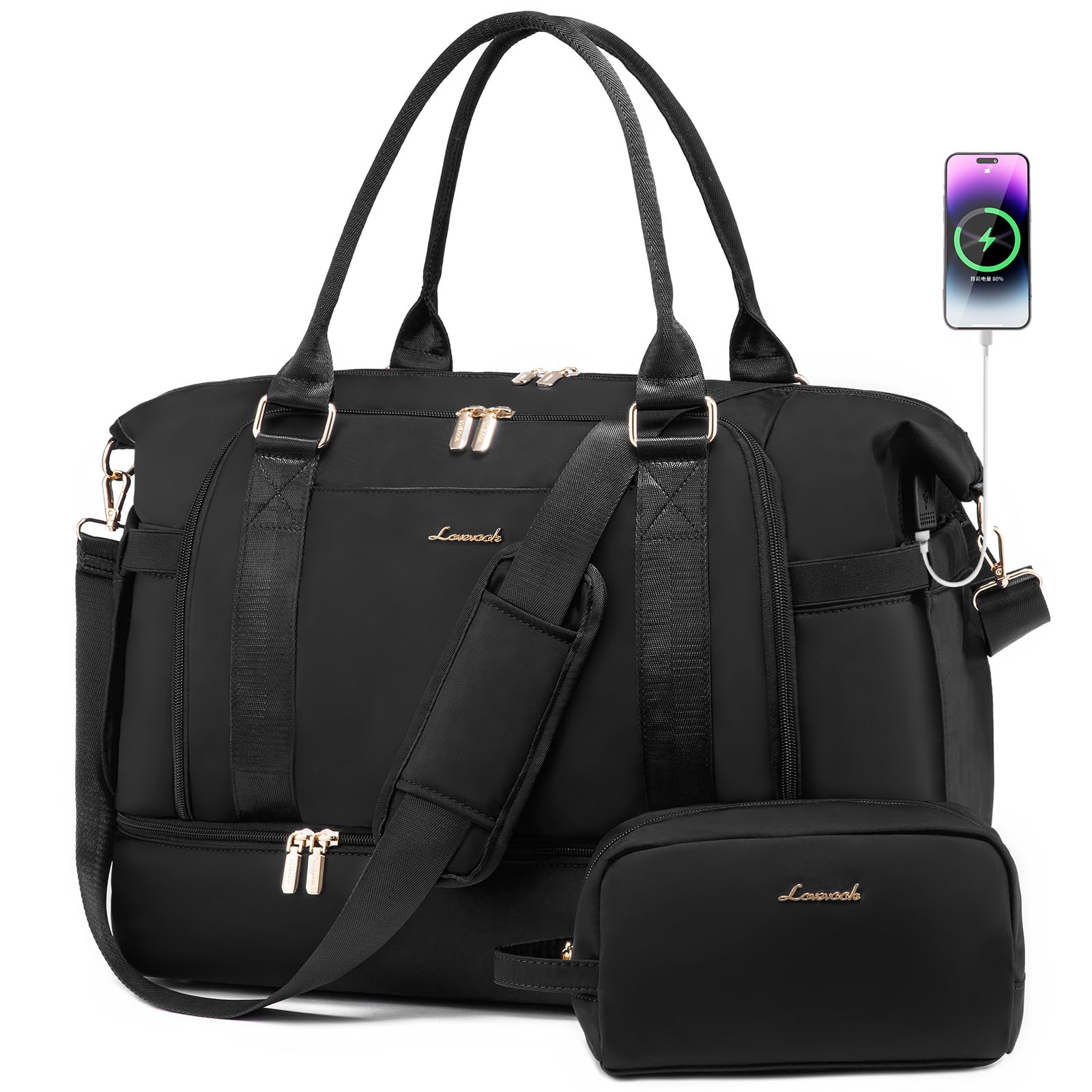 • 【LARGE CAPACITY TRAVEL BAG WITH USB CHARGING PORT+SHOE COMPARTMENT+FREE SEPERATE TOILETRY BAG】this travel bags for women combine with USB charging port,offers an easy access to charge your phone on the go. personal item travel bag with the shoe compartment,you can hold your shoes or dirty clothes for easy separation from clean clothes when traveling,The main compartment can fit 3-4days travel essential items.A large zipper pocket on the front, for storing your daily necessities.