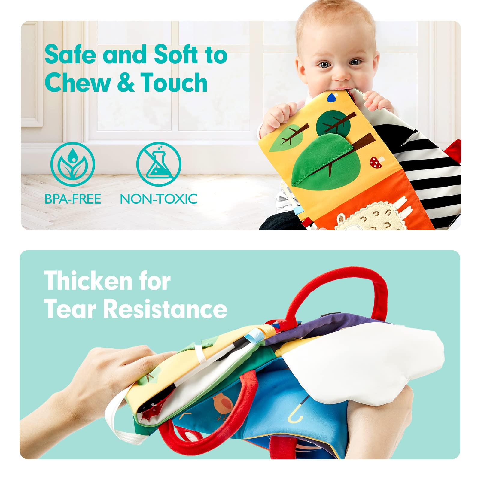 • WITH HANDLES and VELCRO FOR EASY STORAGE and CARRYING: The bottom of the book has a Velcro design, just fold the book in order then can be stick up for easy storage. Besides, there is handle design on the top of book make it easy to carry for travel. These books are great baby Christmas gifts and baby shower gifts as they are soft and have lots of things to look at to keep baby entertained