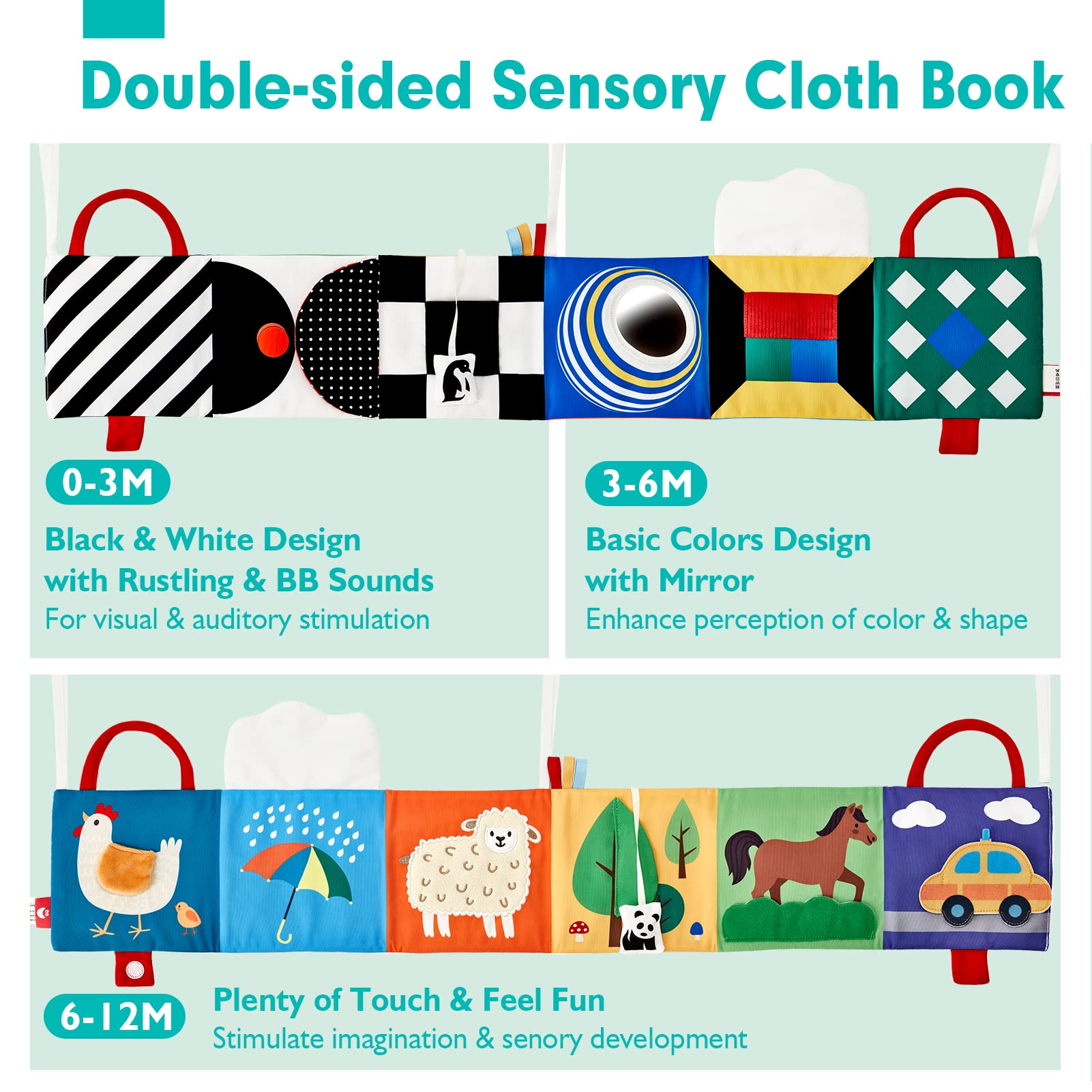 • VERSATILE WITH STAND UP, TIE, FOLD DESIGN: It is sturdy to stand up for tummy time. And there are strings so that you can tied it up to crib, play mat arch, carseat, stroller or anywhere you want. It also can be fold to a book for turn pages and improve baby's hand-eye coordination and fine motor skill