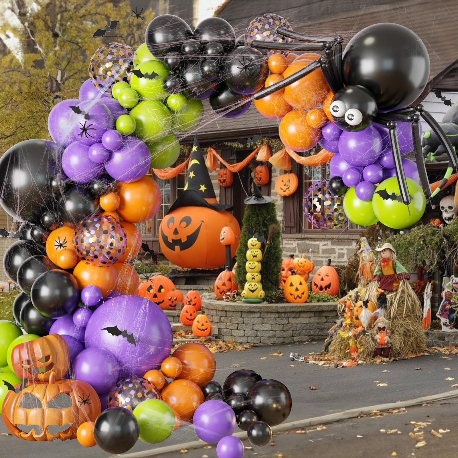 Halloween Balloon Garland Arch Kit with Big Spider DIY Balloons, 131 Pcs Black Orange Lime Green Purple Confetti Latex Balloons Arch with 3D Bats & Spider Web for Halloween Party Decorations Supplies
