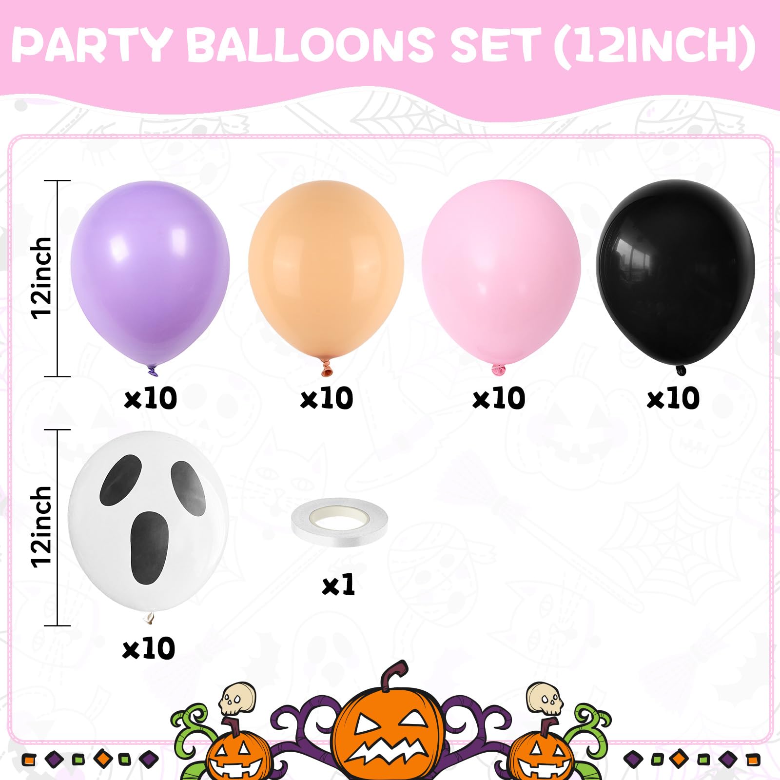 Halloween Balloons,52PCS 12 Inch Halloween Pastel Pink Black Orange Purple Balloon, Ghost Printed Ballons for Halloweenday BOO Party Decorations,Birthday,Baby Shower