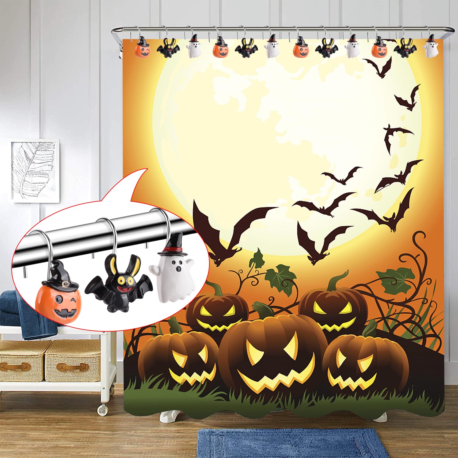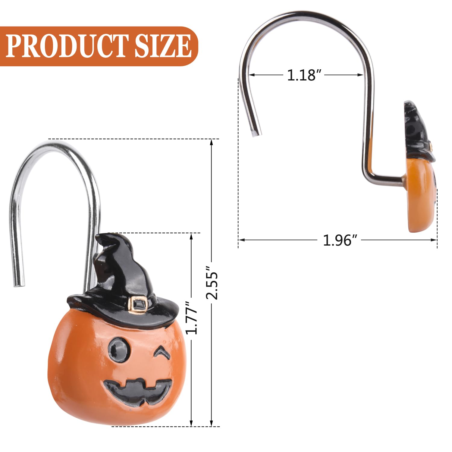 • Halloween Shower Curtain Hooks -- A set of 12 decorative Halloween pumpkin ghost bat shower curtain hooks rings for standard size shower curtain rod.