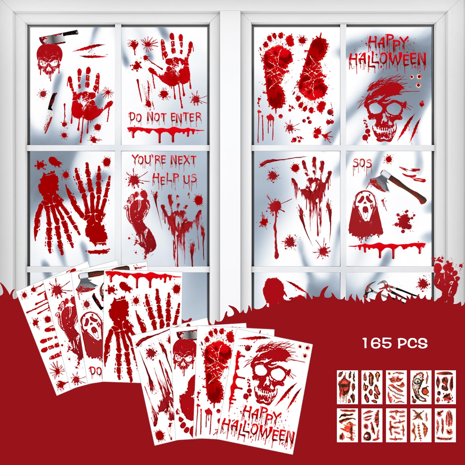 • PACKAGE INCLUDES: 8 sheets bloody handprint and footprint window stickers with 10 sheet Halloween wound tattoos (approximately 165 stickers)