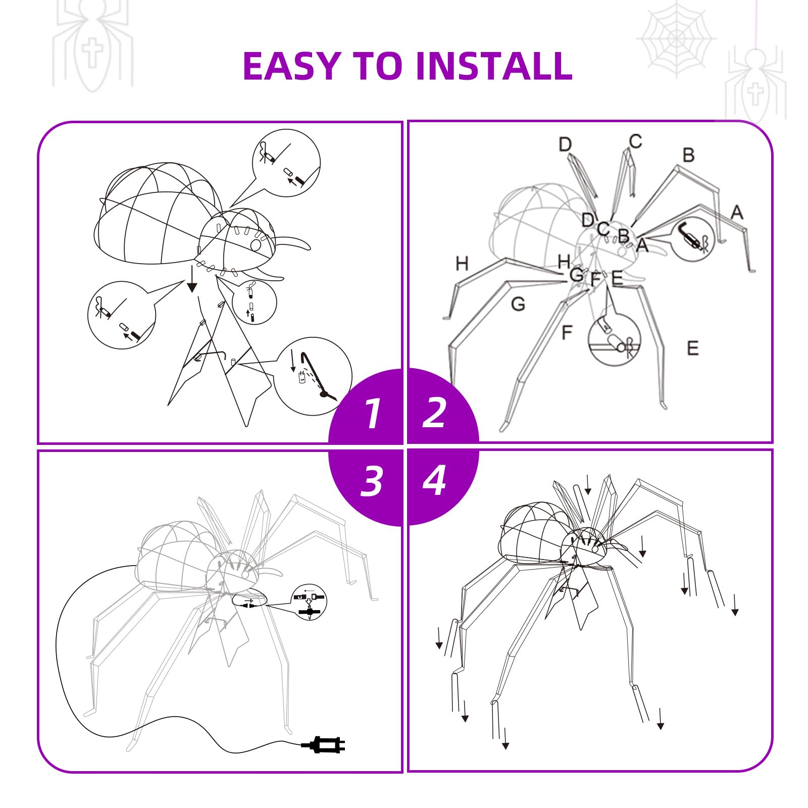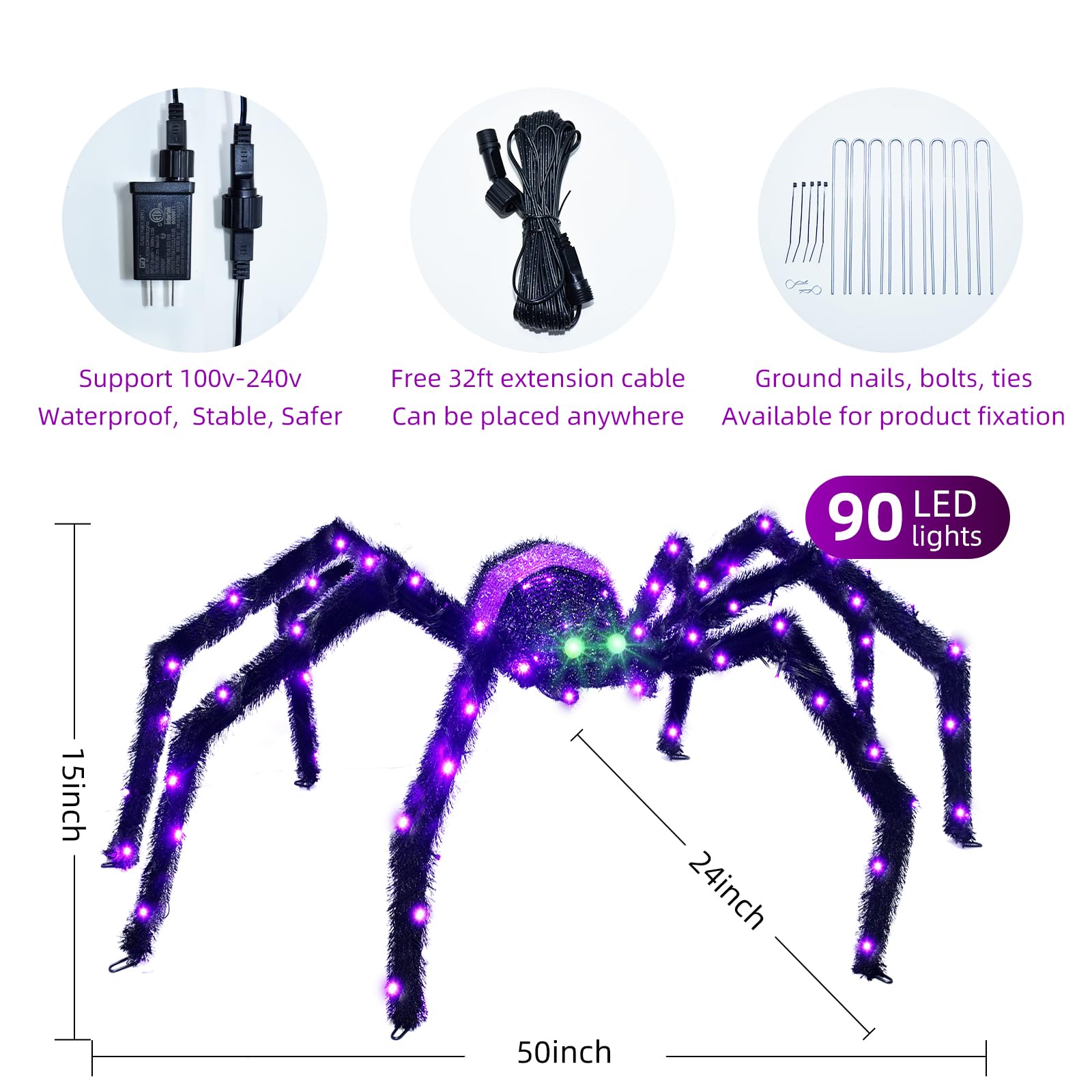 • Lighted Spider & Stable Power Supply: This Halloween decor-lighted Spider has 90 LED lights, with 88 purple LEDs illuminating its body and 2 green LEDs for its eyes. The spider's Halloween decorations are guaranteed to send shivers down your spine, which makes it look even creepier with a 100v-240v wide-range power adapter to keep your Halloween outdoor decorations spider-lit all the time.