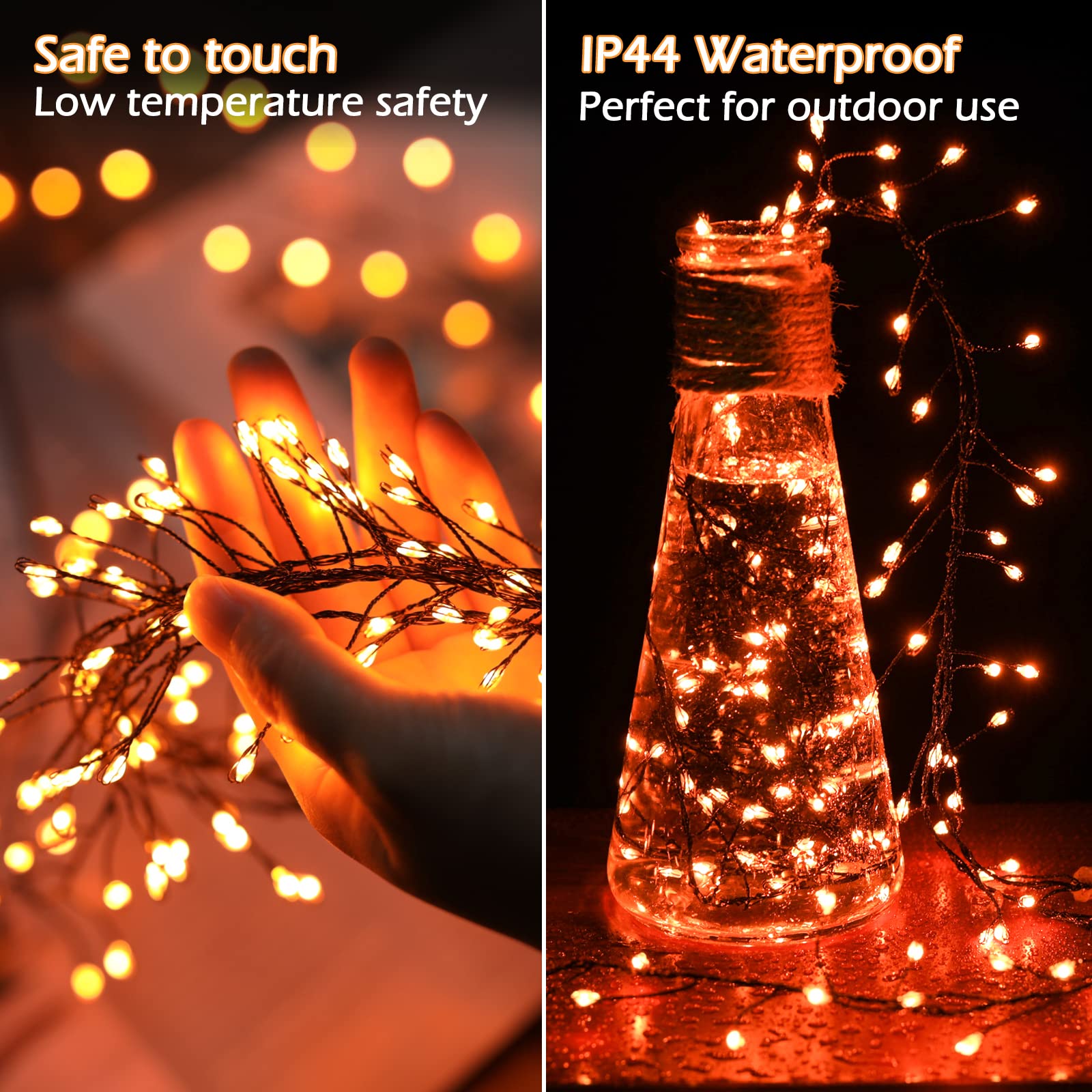 • Mood Lights: With crystal-like resin wrapped LED bead, and quality processed copper off shoots, these upgraded 200 LED cluster fairy light seems a bunch of unfading flower buds waiting for your appearance and taking it home, it is not only amazing for daily decoration but also an impressive gift for your family, friends, relatives, colleague or classmates Tips: although this cluster lights have connect plug ,but the firecracker firefly string lights can not connection