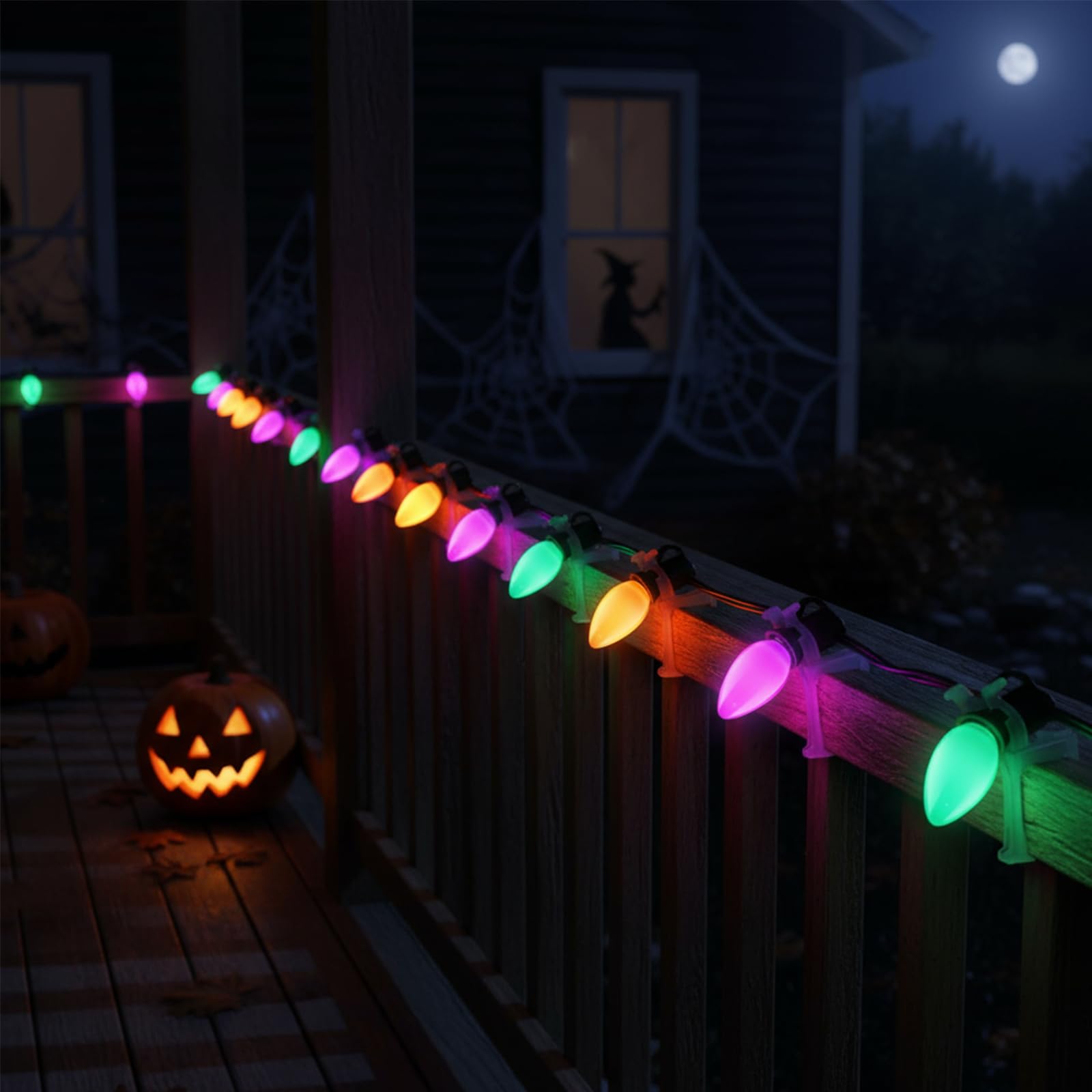 • Spooky & Vibrant Halloween Ambiance: Transform your home into a Halloween wonderland with our 25ft LED Halloween lights. Featuring vibrant orange, purple, and green C7 ceramic bulbs, these lights cast a warm, eerie glow that’s perfect for indoor and outdoor Halloween decorations. Add a magical touch to your yard, porch, patio, garden, and more.