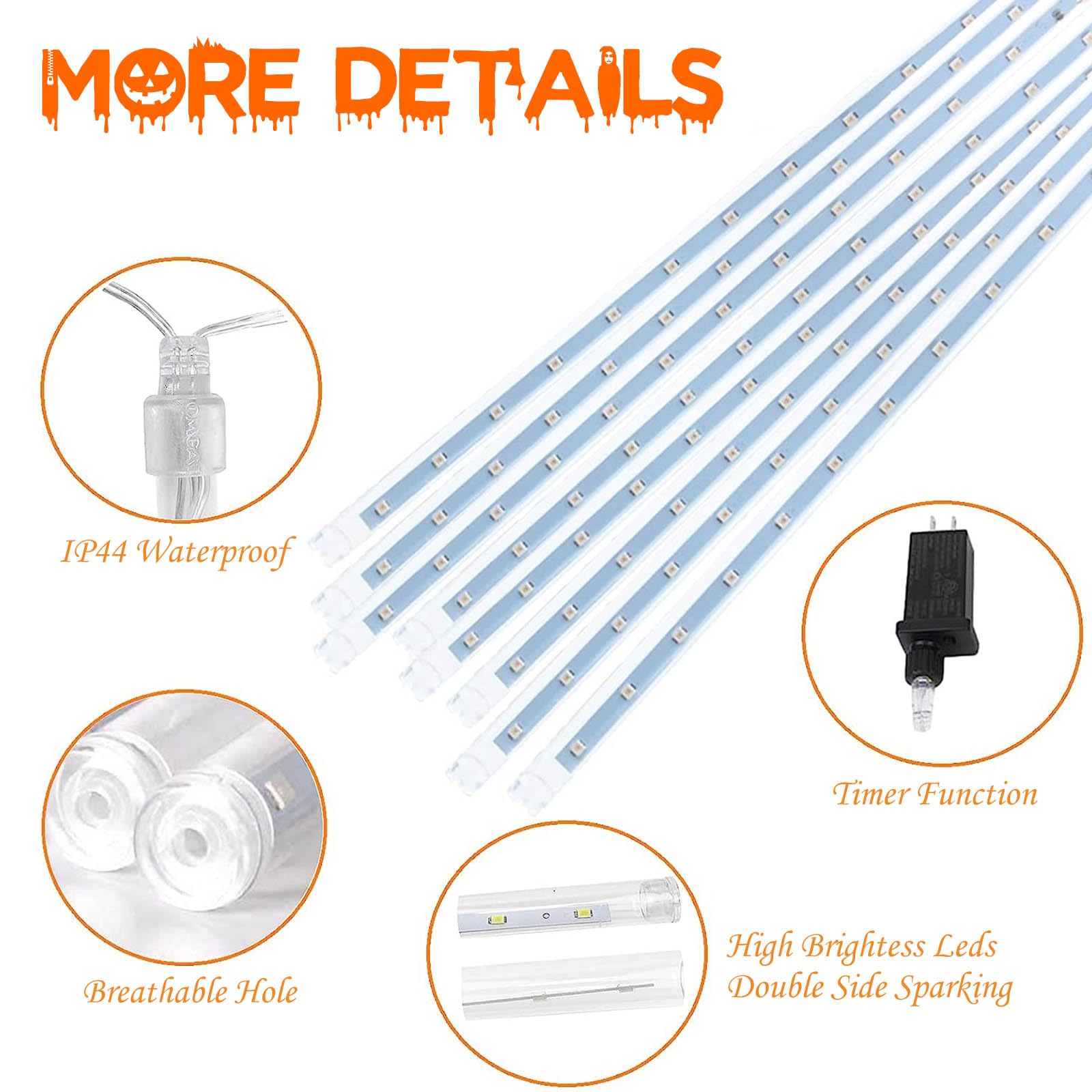 • Halloween Meteor Shower Lights: Each package contains 2 connectable Halloween lights outdoors. Each set includes 8 tubes with 192 LEDs, resulting in a total of 16 tubes and 384 LEDs per package. The double-sided LEDs within the tubes ensure omnidirectional illumination