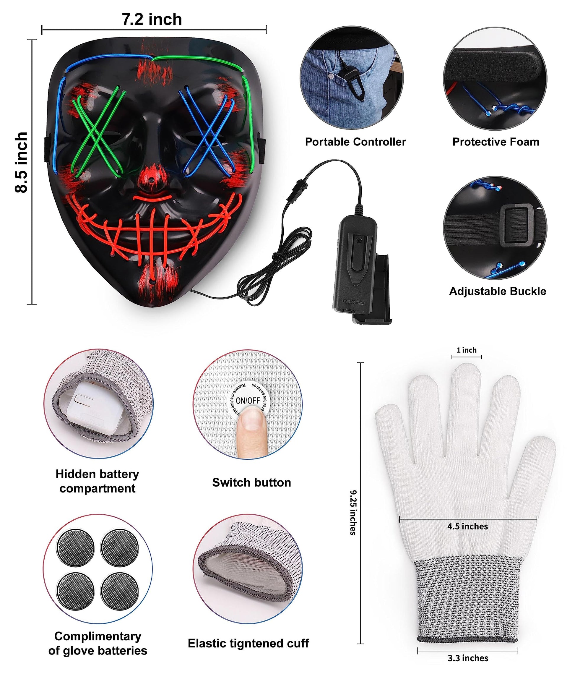Halloween Mask Skeleton Gloves Set, Light Up Scary LED Mask with Glow Gloves, Halloween Costumes for Boys Girls, Redbluegreen