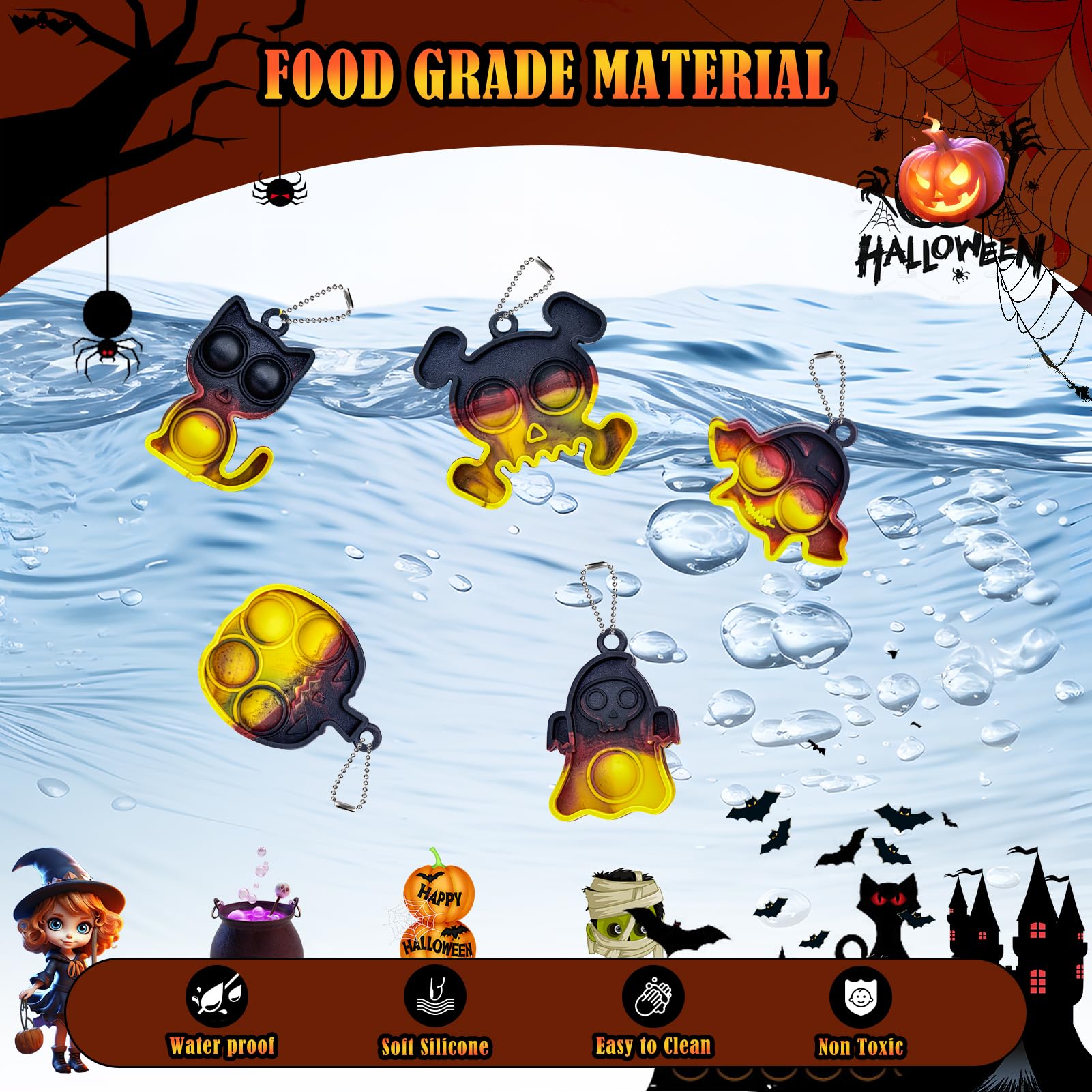 • Halloween Goodie Bag Fillers for Kids: Halloween mini pop keychain fidget toys are made of food grade silicone material, non-toxic and tasteless, safe and soft, waterproof, easy to clean. Halloween pop keychain with chain that can be fastened on a backpack for easy carrying, you can play and squeeze anytime anywhere. Bulk halloween pop toys for kids party favors, it help relieve stress, targets anxiety, ADHD, autism, OCD toys, improve concentration. Perfect kids party favors toys gifts idea.