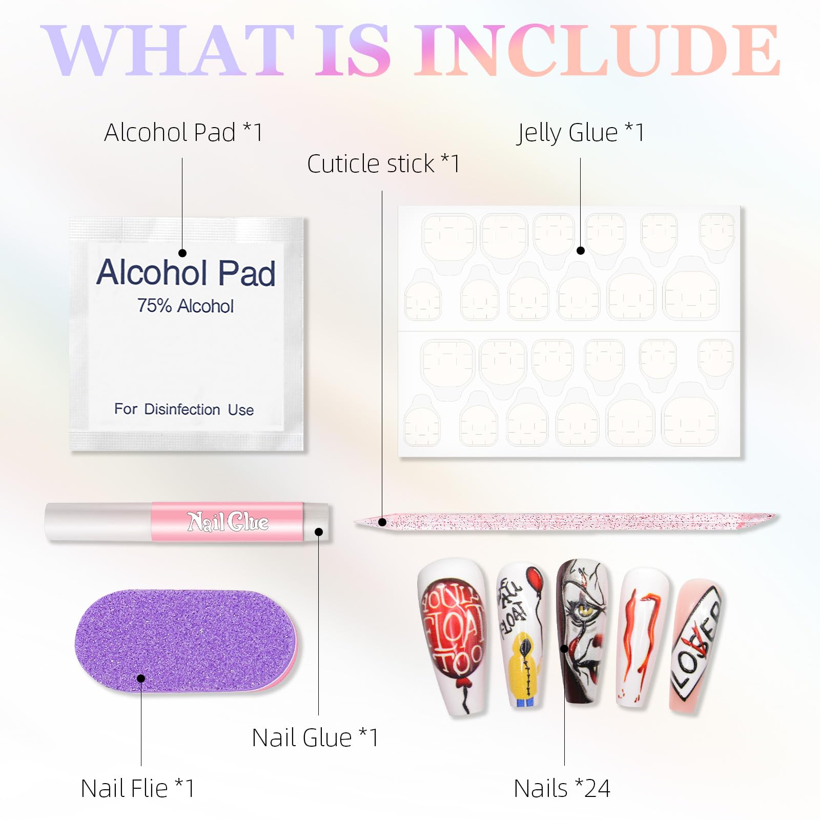 Halloween Press on Nails Long Ballerina Fake Nails Horror Joker and Red Balloon Design False Nails Kit Full Cover Artificial Nails Reusable Glue on Fake Nails Press ons Halloween Manicure 24Pcs