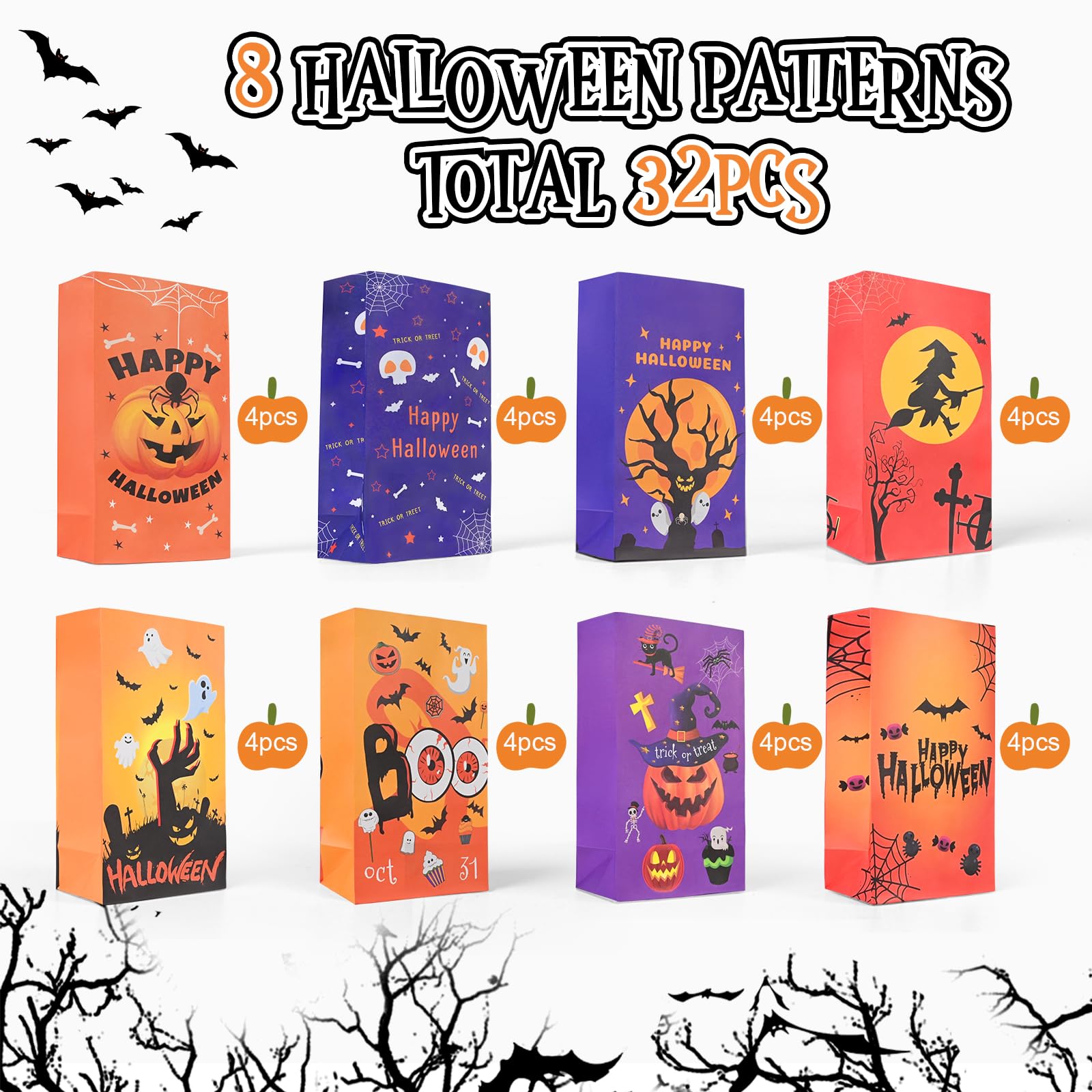 • EASY TO USE - Includes 32 Halloween treat bags for candy and 36 Halloween sealing stickers. The Halloween trick or treat bags measure 7.1*3.9*2.4 inch, which can hold a large amount of candy and allow kids to collect more snacks when trick-or-treating. The Halloween treat bags paper are designed with a wide opening to make it easy to put candies, toys and other Halloween treats in or take them out, and you can use the stickers we provide to keep the bags sealed.
