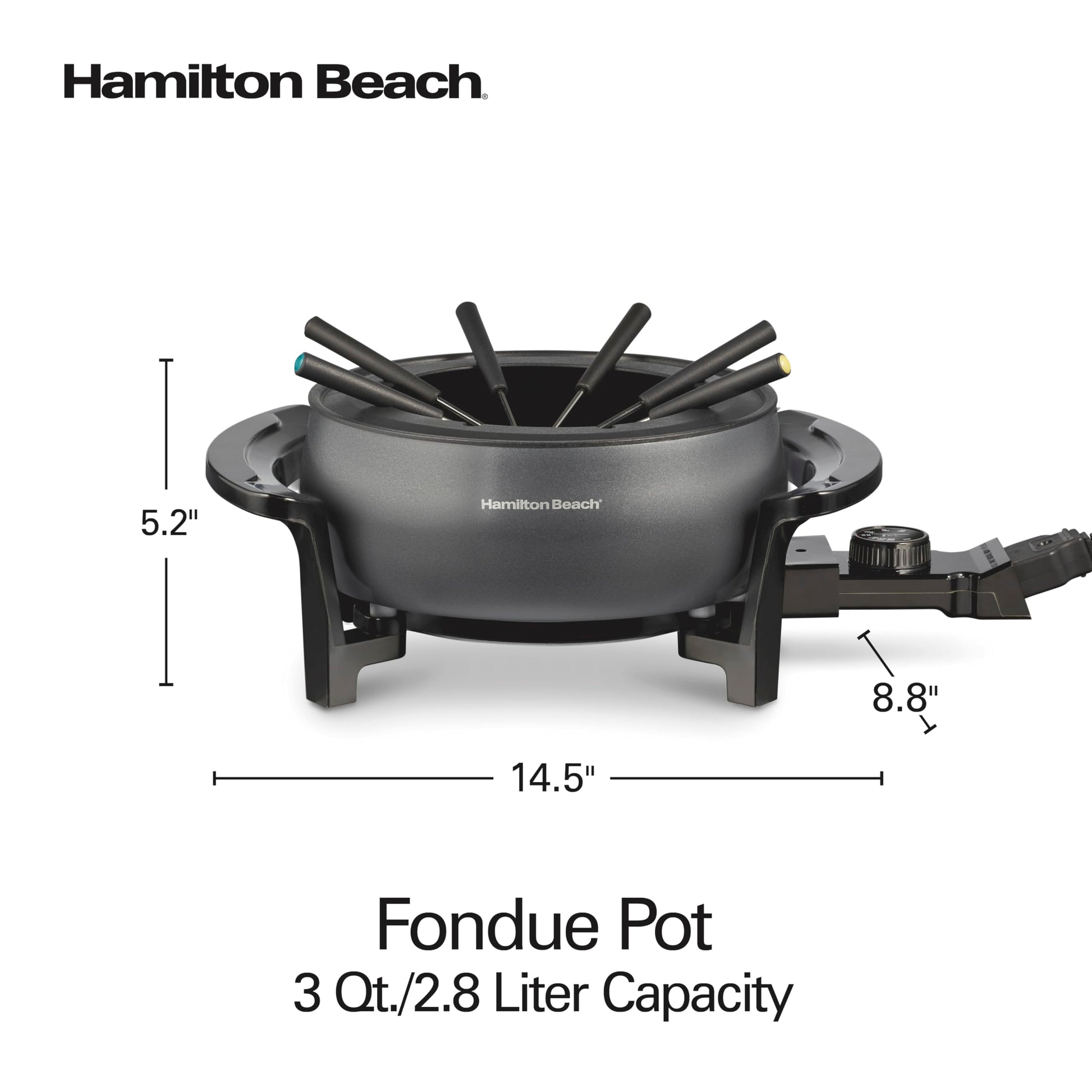 Details: The Hamilton Beach® 3 Quart Fondue Pot makes entertaining fun and easy. It's great for making cheese, chocolate, hot oil or broth fondue. The durable fondue pot has a PFAS-free ceramic nonstick interior for easy cleanup. Includes 6 fondue forks.
