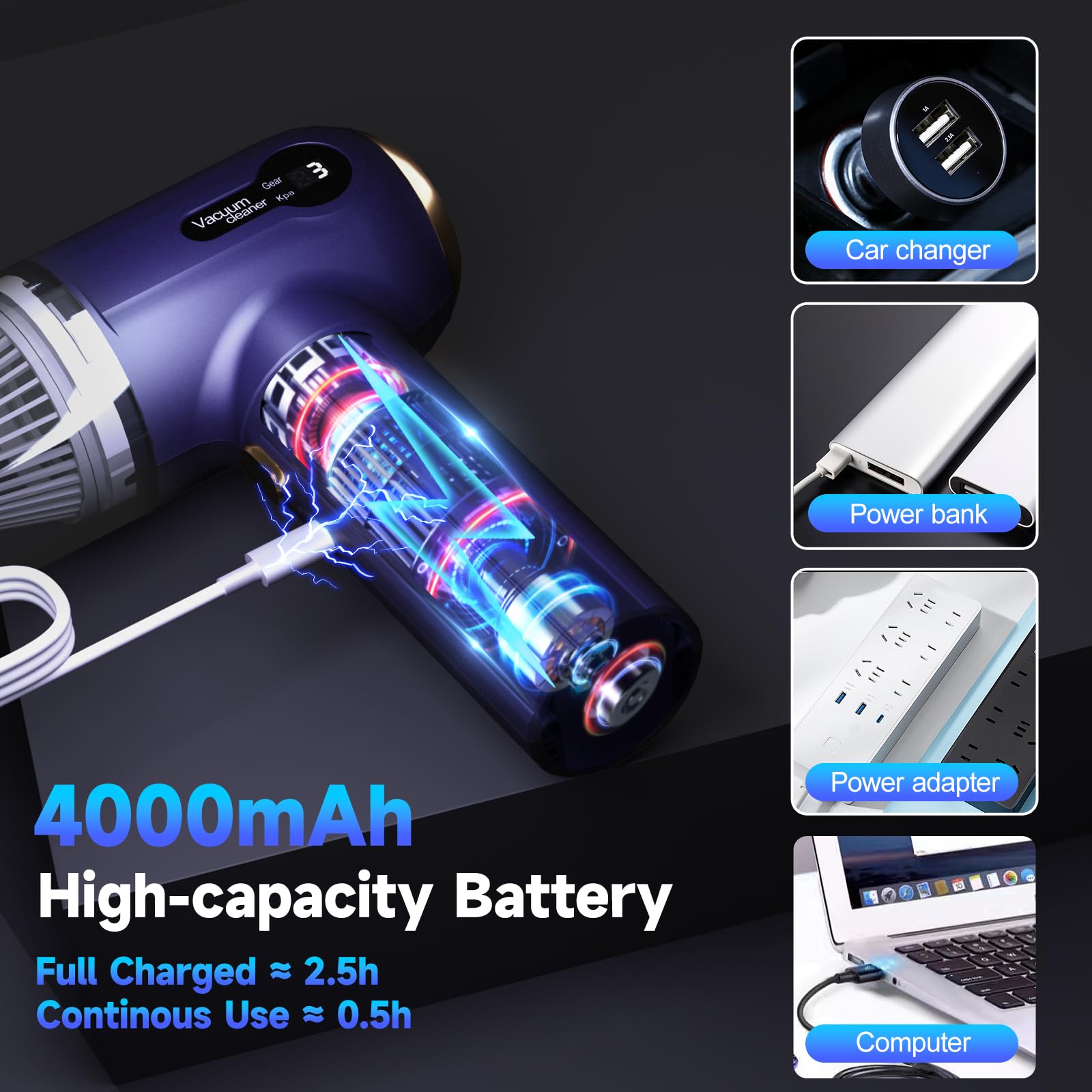 • 【4000mAh Rechargeable Battery & Fast Charging】: Equipped with a 4000mAh battery, this cordless vacuum offers 20-30 minutes of continuous use on a single charge. Recharge in just 2.5 hours via Type-C port using a car charger, power bank, or laptop. The LED indicator shows charging status: white for fully charged, red for low battery. Perfect for quick cleanups, travel, and emergency use.