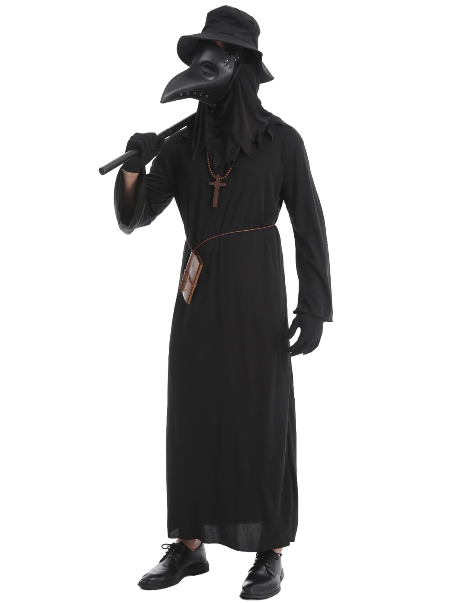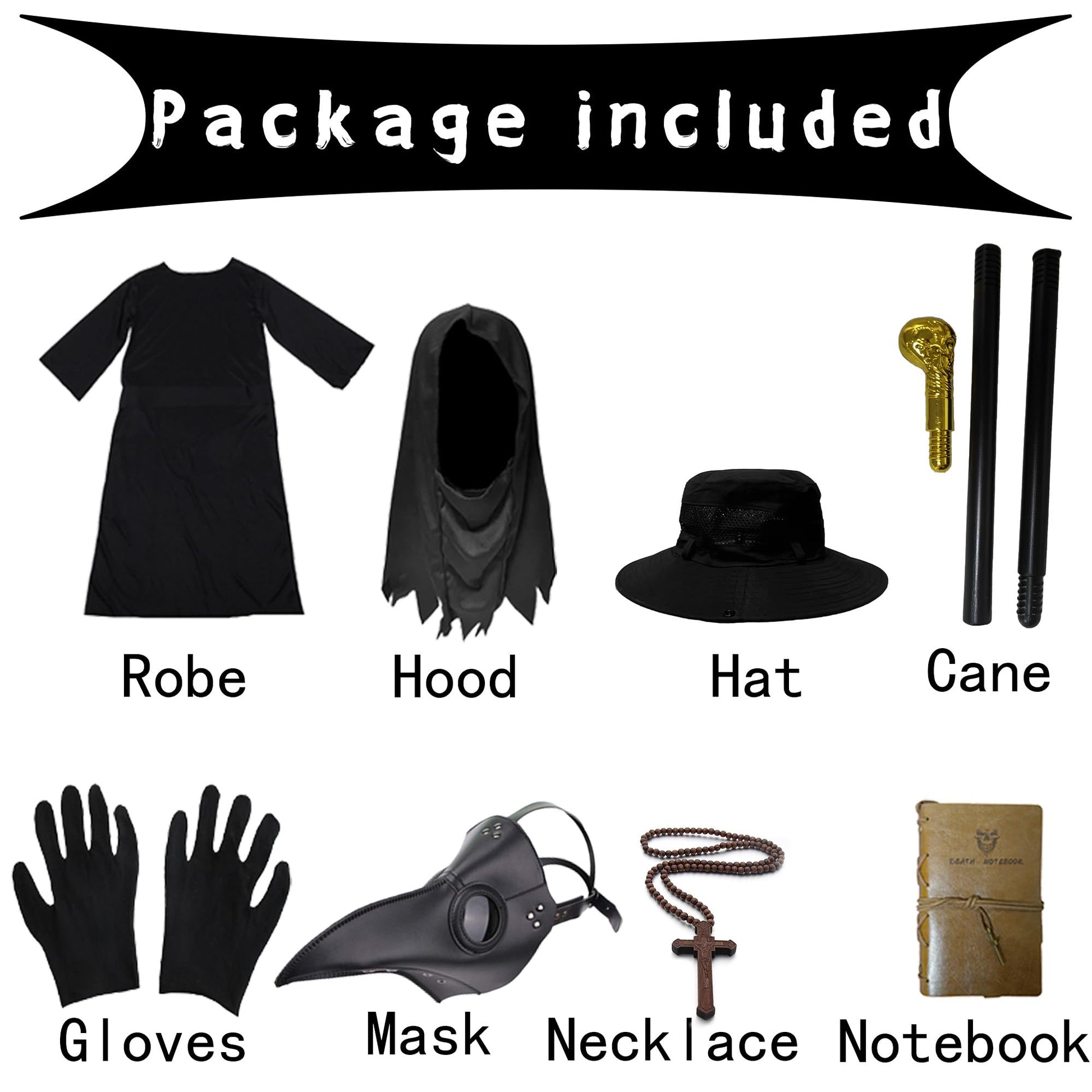 • 【8 IN 1 PACKAGE INCLUDE】1 * Black hat,1 * PU leather plague doctor mask,1 * Black robe,1 * Wooden cross necklace,1 * Black glove,1 * Halloween cane, 1 *Black cloak 1 *Brown notebook.