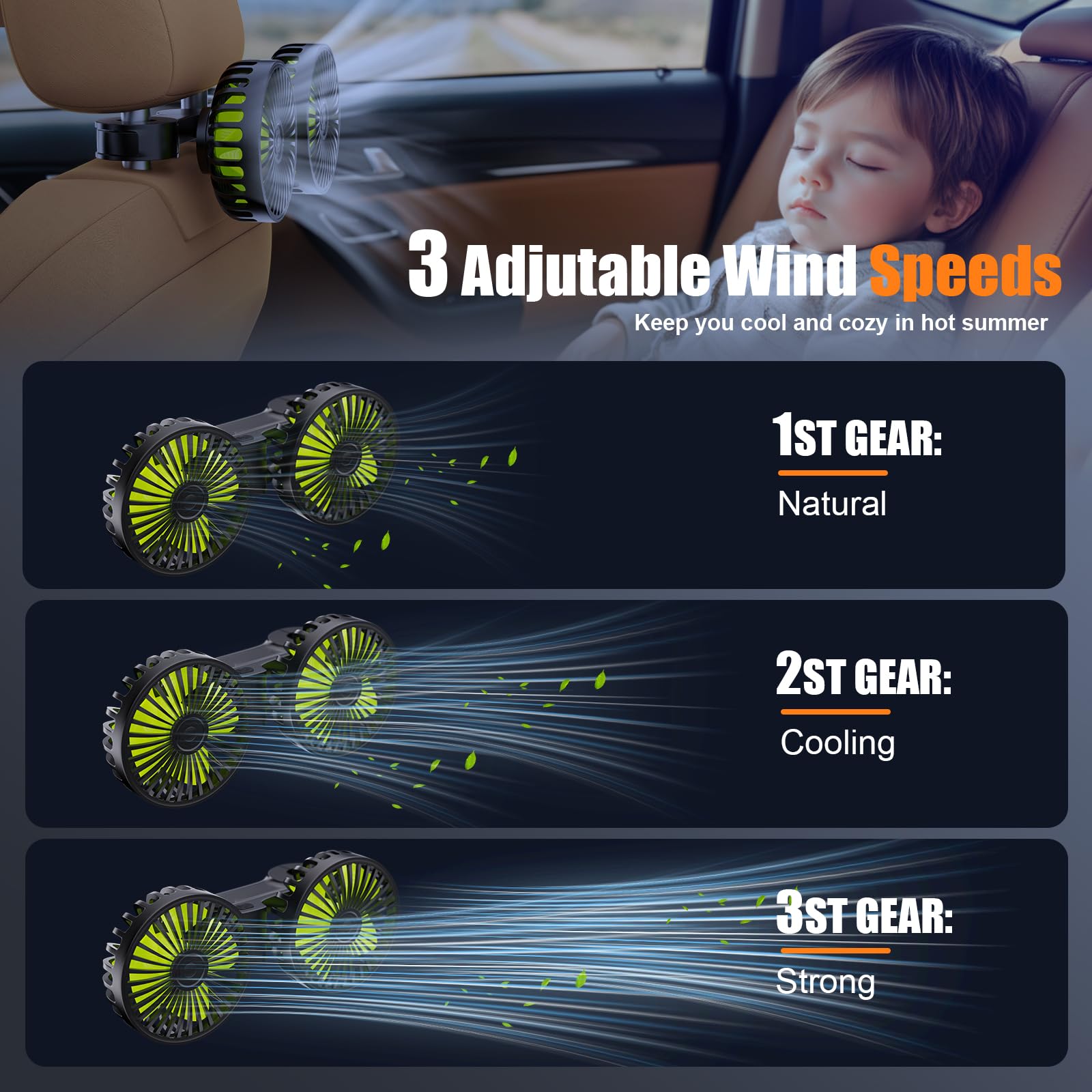 • 【3 SPEEDS & 360° ROTATION】Featuring 3 speed settings - low, medium, and high - the car fan for back seat allows you to adjust the airflow according to your preferences and weather conditions. With a 90°rotation for the fan head and 360°adjustability for the fan base, it provides a cool breeze to passengers and pets in every corner of the car. Easily adjust the fan angle to cool both front and back seats, ensuring a comfortable environment for baby or pet in rear seat