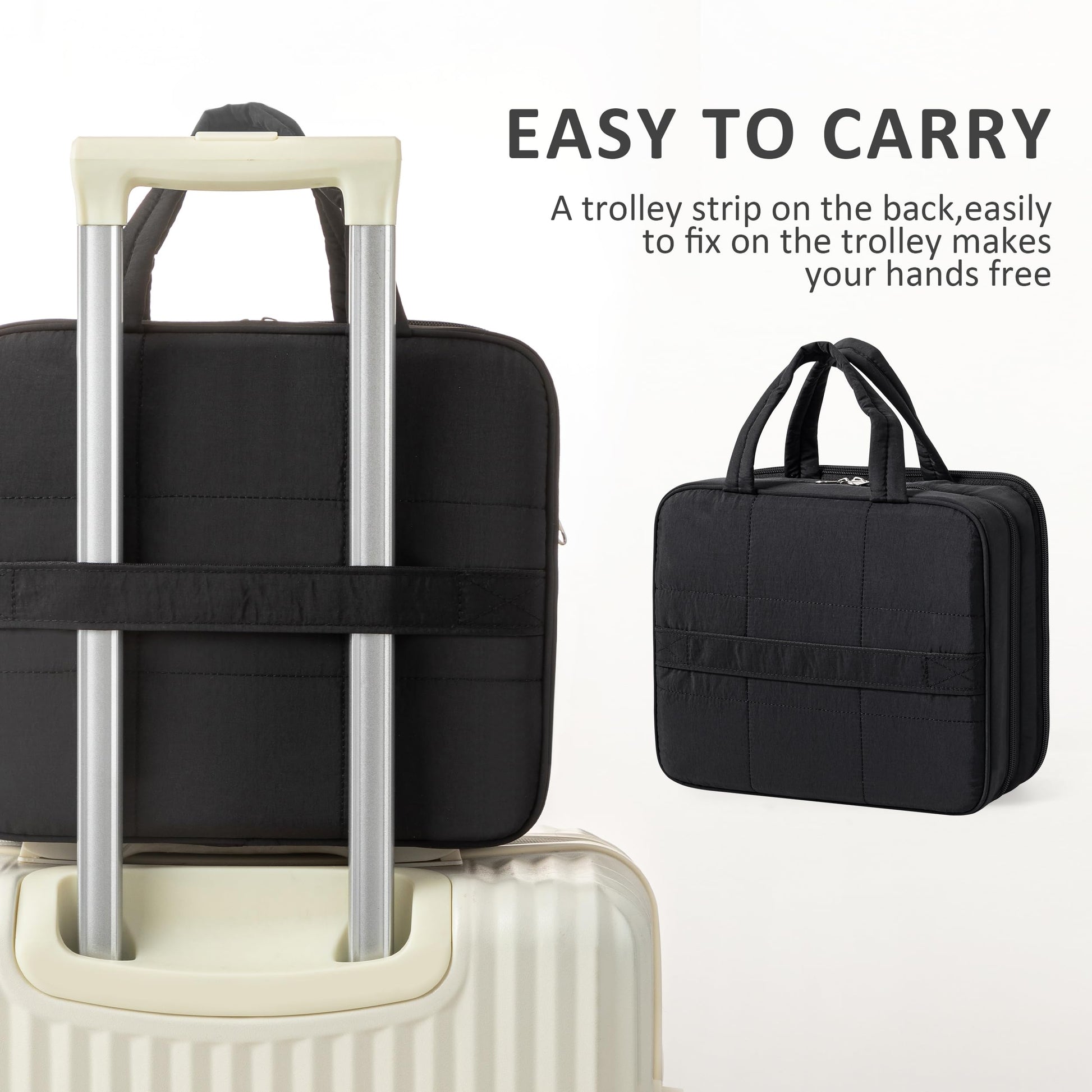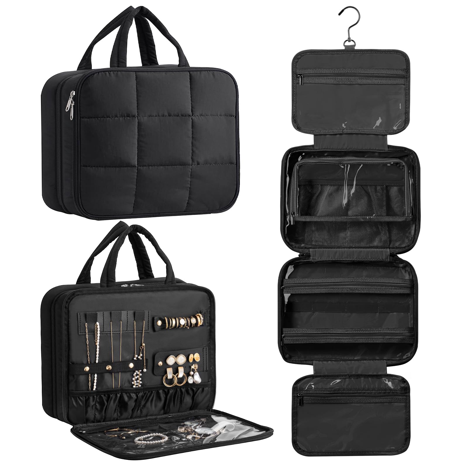 HBlife Travel Toiletry Bag with Jewelry Organizer for Women, Puffy Hanging Travel Bag for Toiletries with Trolley Belt, Waterproof Makeup Cosmetic Bag, Travel Accessories Essentials(Black, M)