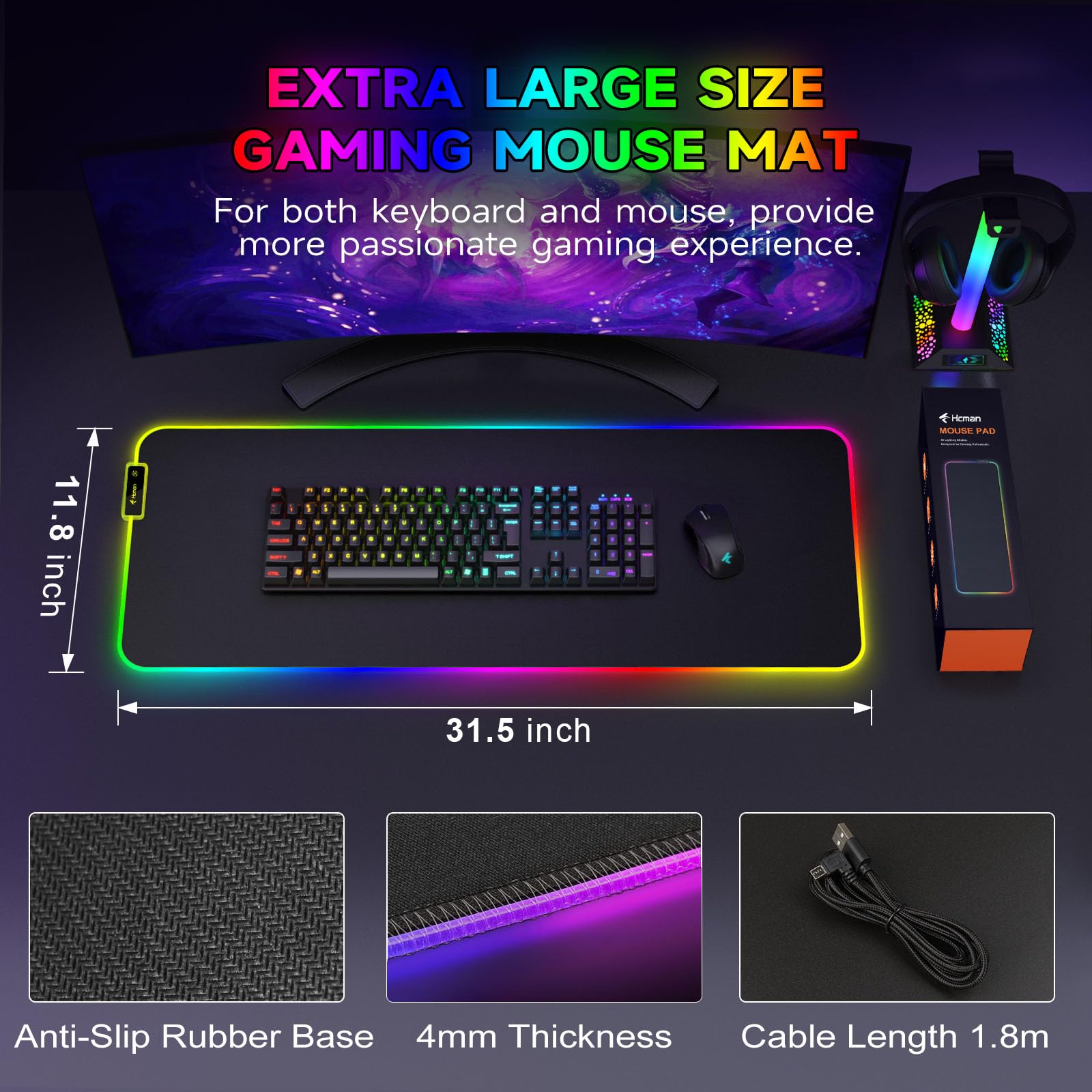 Hcman RGB Gaming Mouse Pad, Large Mousepad with Led Light, PC Gaming Accessories Black Keyboard Pad for Desk, Non-Slip Rubber Base XXL Big Mouse Mat for Gamer Boy Men Gift (31.5 X 12 Inch)