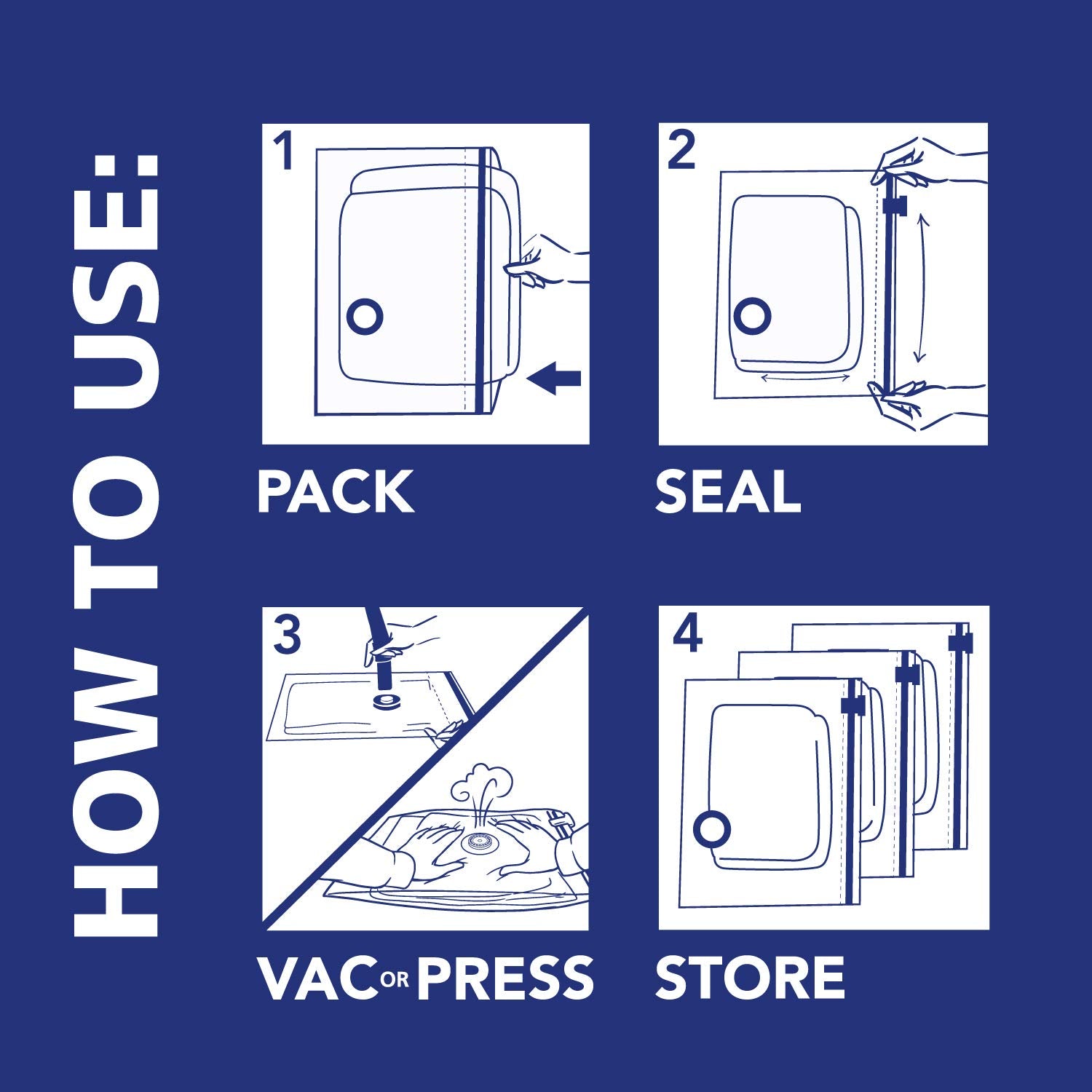 • Easy to Use: These bags feature an intuitive closure system that creates an easy air-tight seal, just Pack, Seal, Vac (or Press) and Store