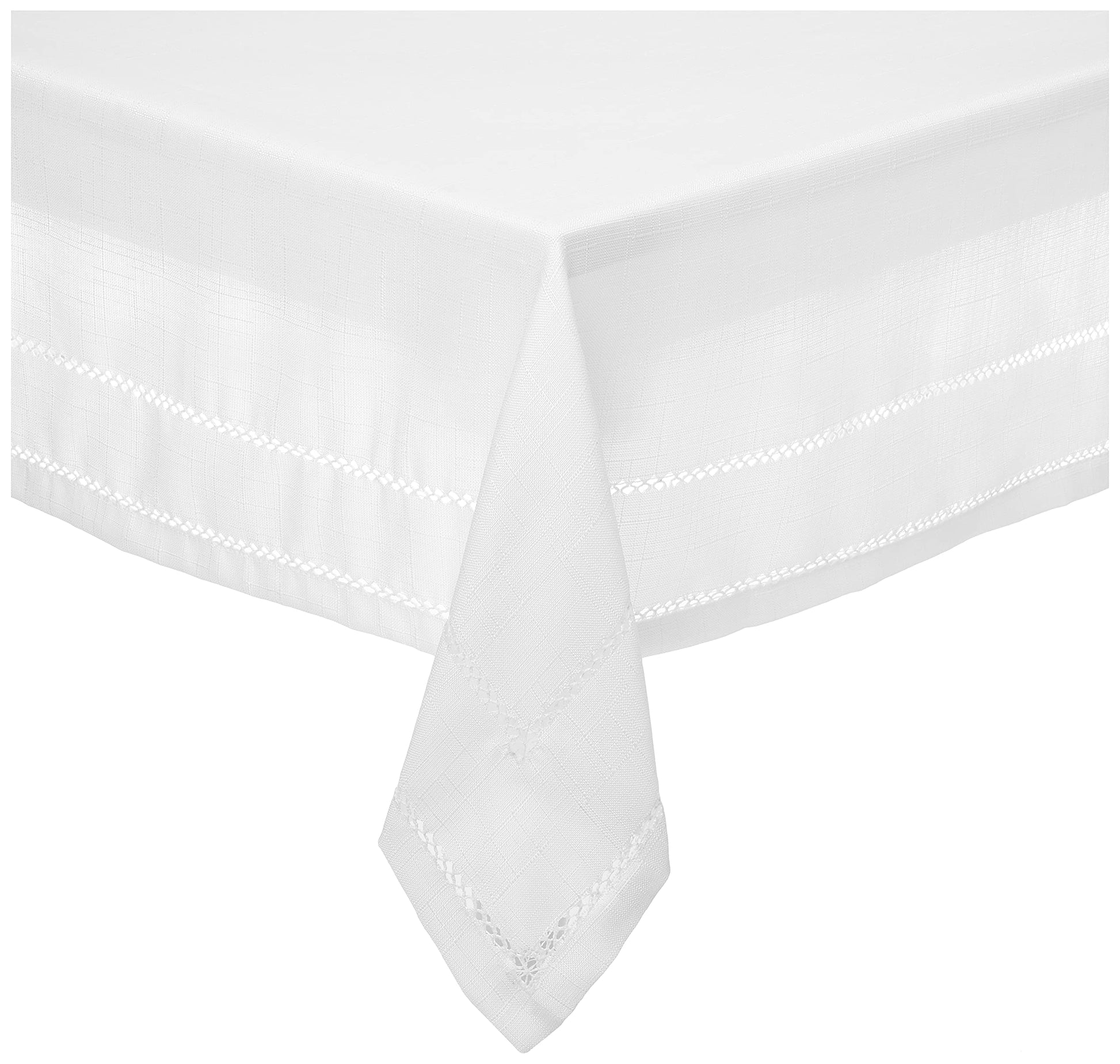 Dresses up dinner. OR any meal. With this appealing tablecloth. Kitchen accessory combines the soft, visual appeal of cotton with the durability of polyester. Hem stitch embroidered vintage design tablecloths. Available in White, oatmeal, blue and mint color options. 100Percent polyester. Machine washable, imported,