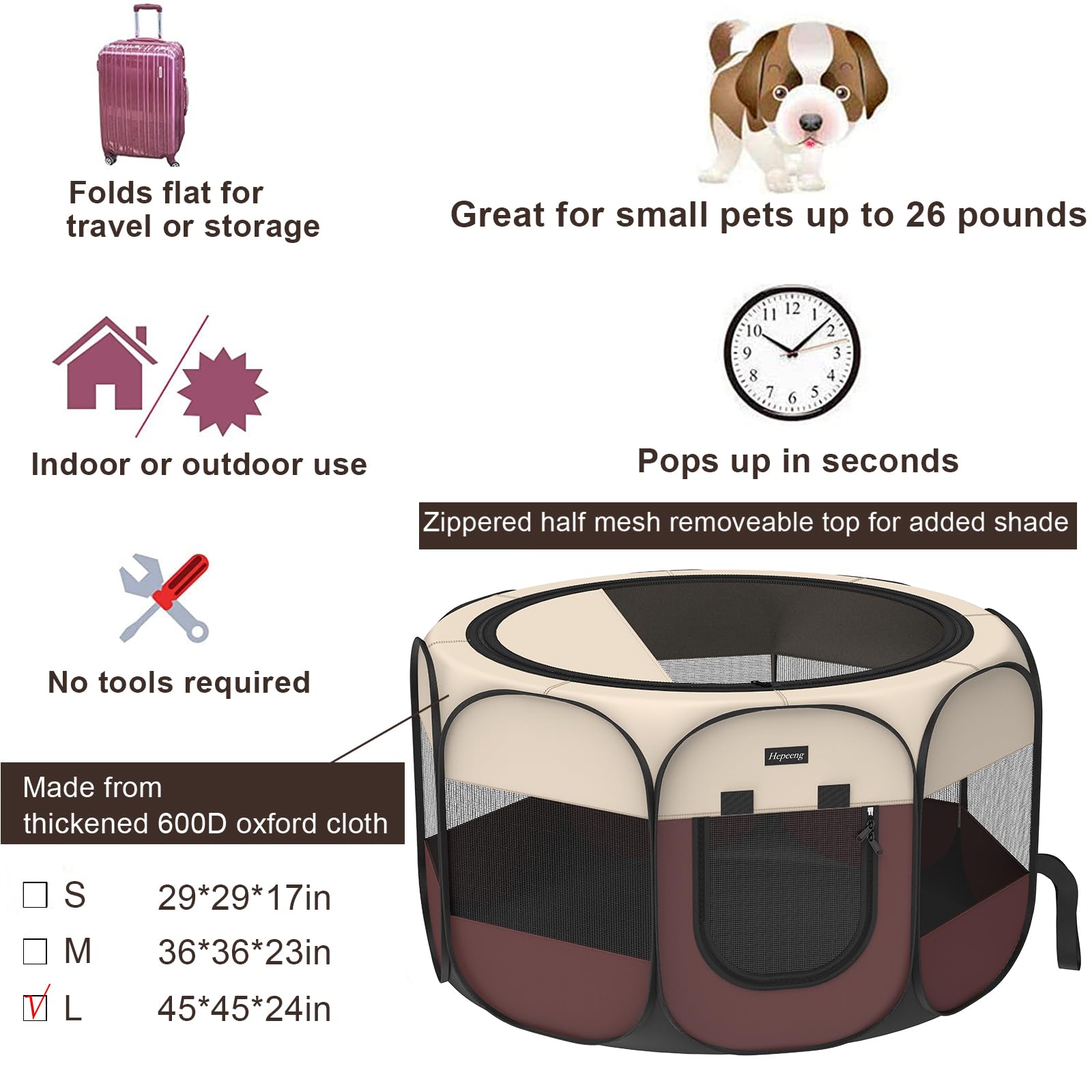 Hepeeng Portable Foldable Pet Dog Cat Playpen and Puppy playpen Pet Tent with Carrying Case Collapsible Travel Bowl Indoor/Outdoor Use with Water Resistant and Removable Shade Cover