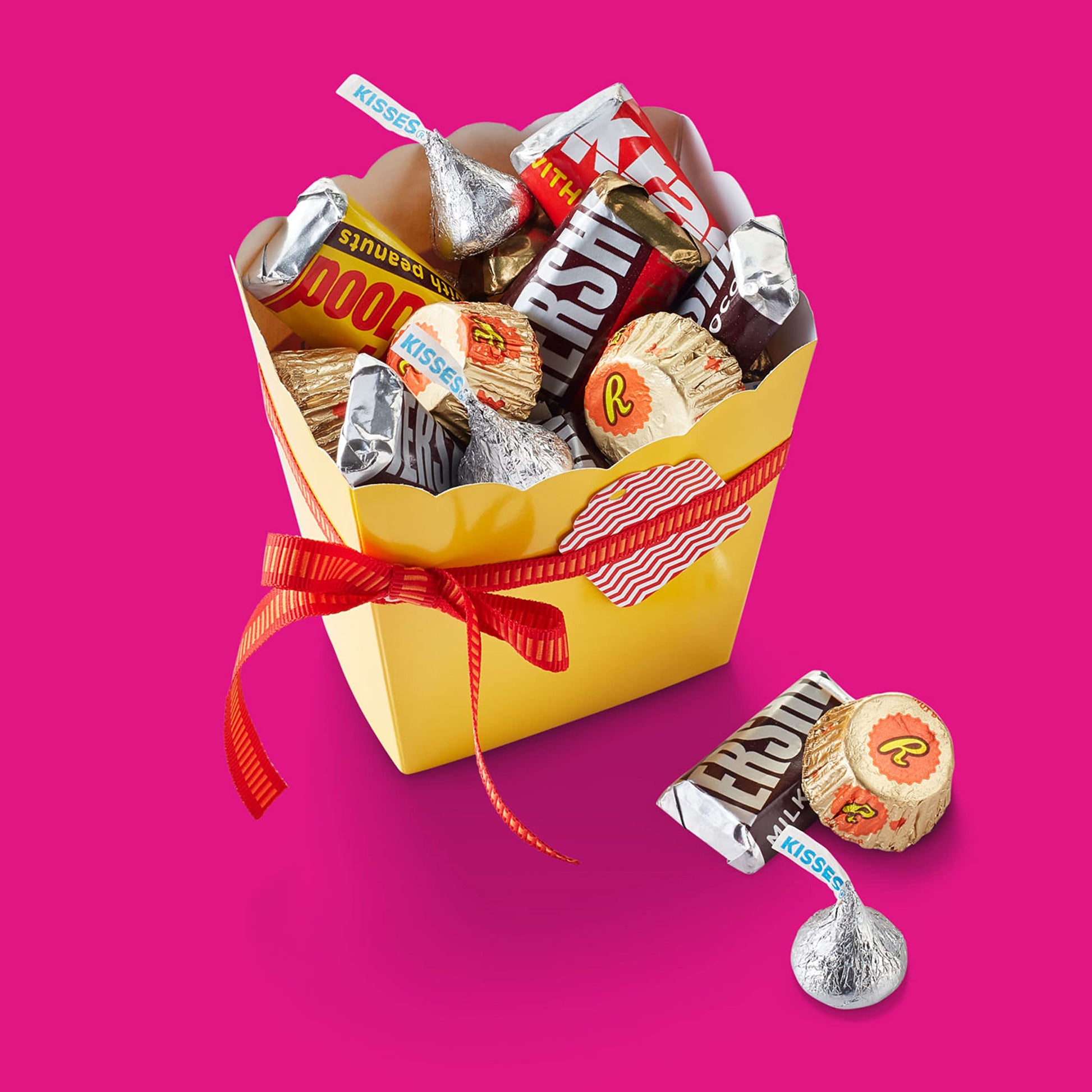 Details: Enjoy a delicious chocolatey candy treat anywhere and anytime with HERSHEY'S and REESE'S Miniatures assorted chocolate candy, perfect for candy dishes and gift boxes. Offering six crowd pleasing favorites, this candy assortment is perfect for sharing with family, friends, teammates or co-workers. This assorted bag of chocolate candies contains HERSHEY'S KISSES milk chocolate candy, REESE'S Miniatures milk chocolate peanut butter cups, HERSHEY'S milk chocolate bars, HERSHEY'S KRACKEL chocolate candy with crisped rice bars, HERSHEY'S SPECIAL DARK mildly sweet chocolate candy bars and HERSHEY'S MR. GOODBAR chocolate candy with peanuts bars. There's something for everyone in this classic assortment!