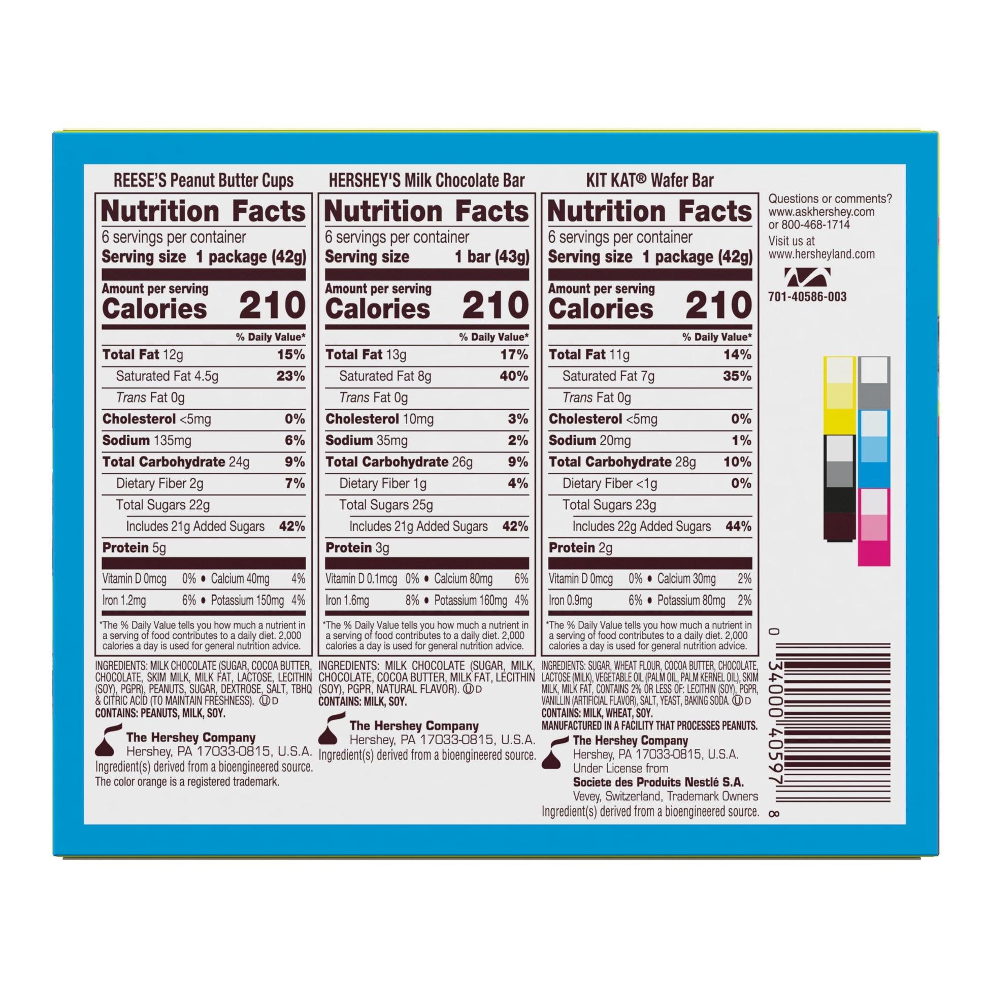 • Contains one (1) 27.3-ounce, 18-count variety pack of HERSHEY'S, KIT KAT and REESE'S Assorted Milk Chocolate Candy Bars