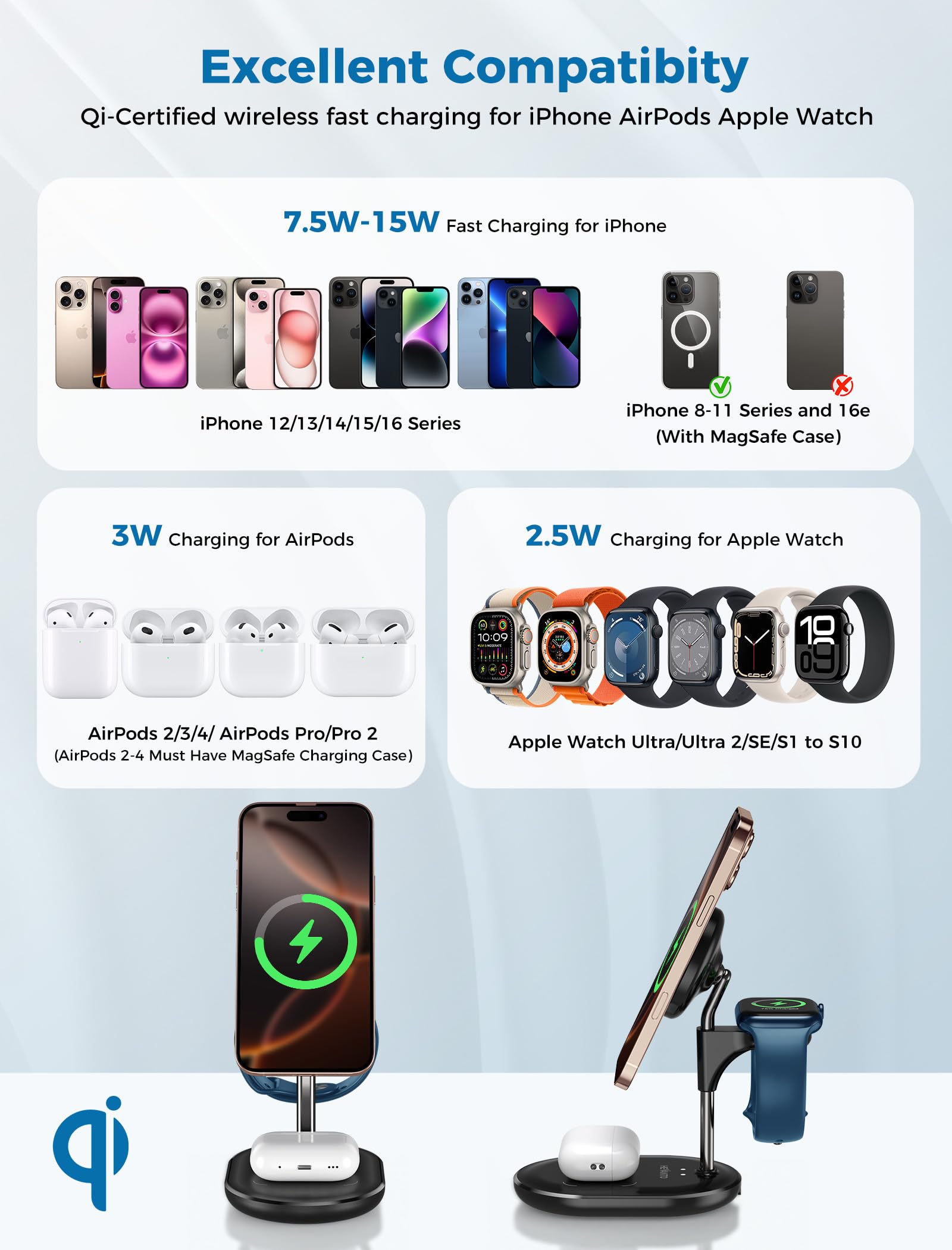 • โœ…๐„๐ฑ๐œ๐ž๐ฅ๐ฅ๐ž๐ง๐ญ ๐‚๐จ๐ฆ๐ฉ๐š๐ญ๐ข๐›๐ข๐ฅ๐ข๐ญ๐ฒ - Bye-Bye to the tangled adapters and cables! Hevanto 3 in 1 charging station for apple is compatible with iPhone 12 13 14 15 16 Series(iPhone 8-11, 16e with Magsafe case) Apple Watch Series and AirPods Pro/Pro 2, AirPods 4 3 2 Must Have MagSafe Charging Case. The must-have mag-safe charger stand for you to simplify your lives.