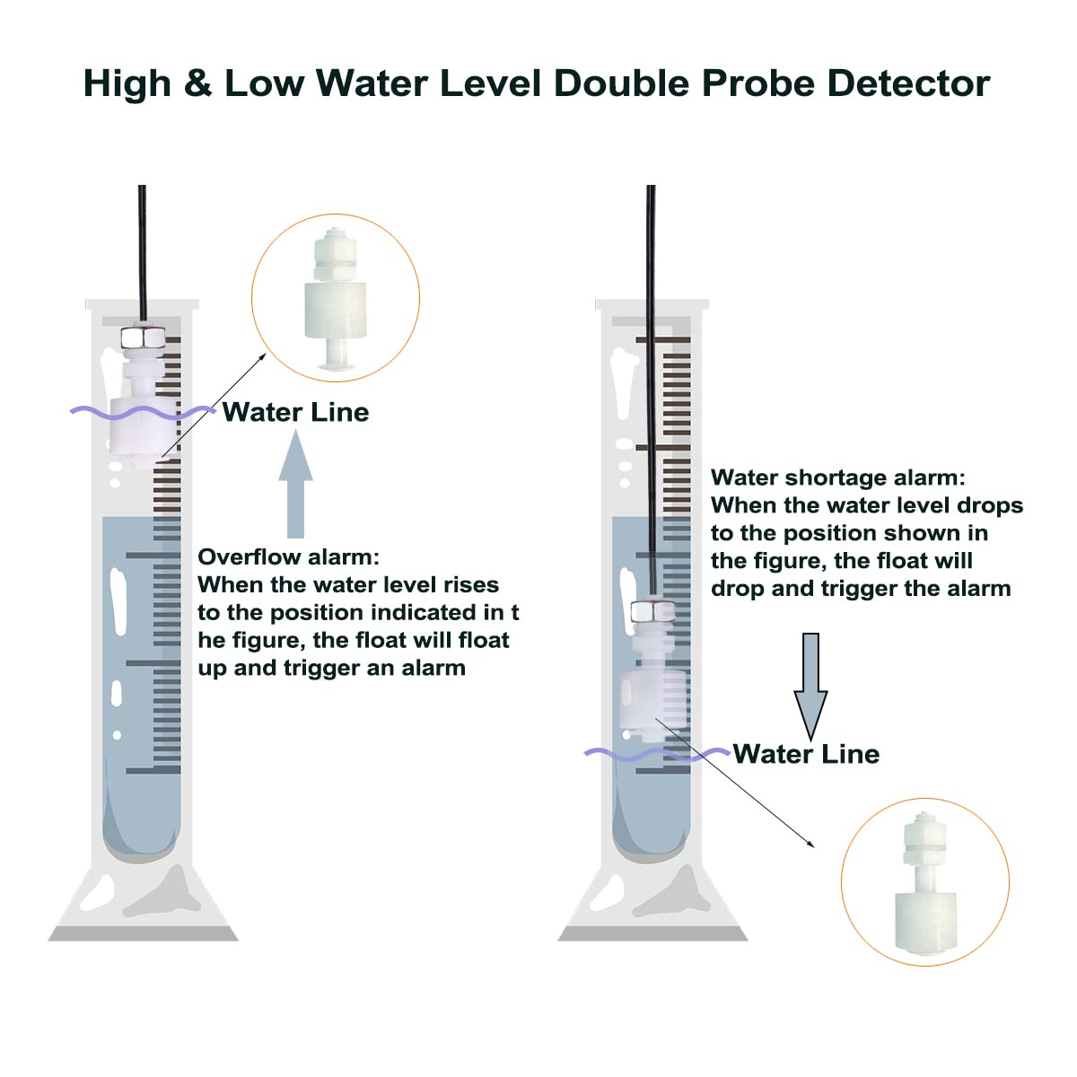 • 【Dual 5 Meter Floating Probe Design】- It can detect water shortage or overflow. You can choose to use one or both functions according to your needs. The overflow probe is placed above the water level. When the water level rises to the detection position, the float will rise and trigger the magnetic induction, thus triggering the alarm. Instead, the water shortage probe is always placed in the underwater position, which triggers an alarm when the water level drops below the float.