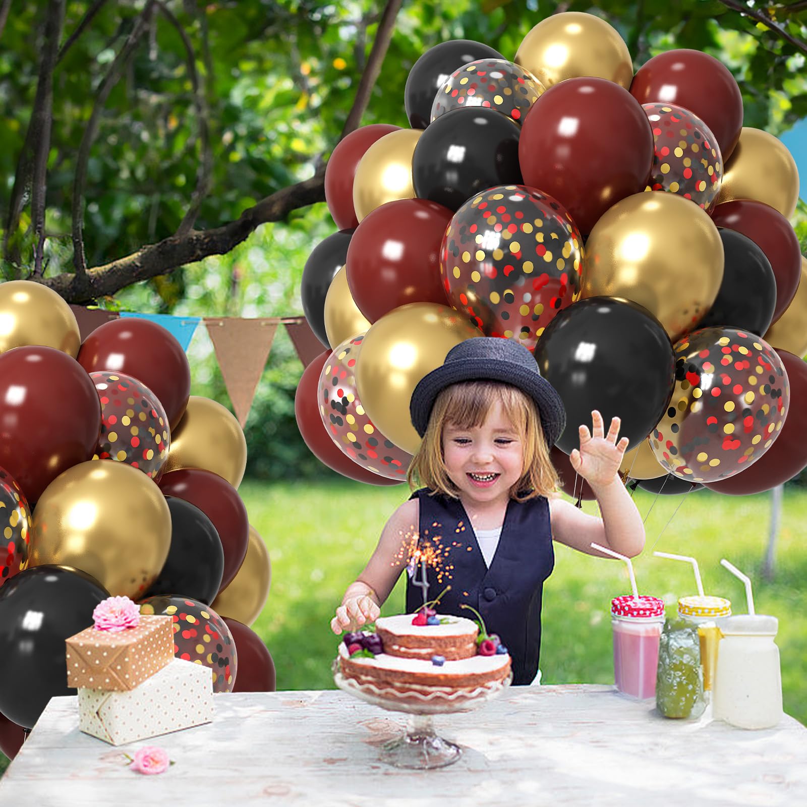 • Dark Red Black and Gold Balloon: Includes metallic gold balloons (12 in; 10 pcs ); matte black latex balloons (12 in; 10 pcs ); ruby red balloons (12 in; 10 pcs ); confetti balloon(12 in; 5 pcs ) and a roll white ribbon; This balloons matte black gold red can add a unique atmosphere to your burgundy themed birthday