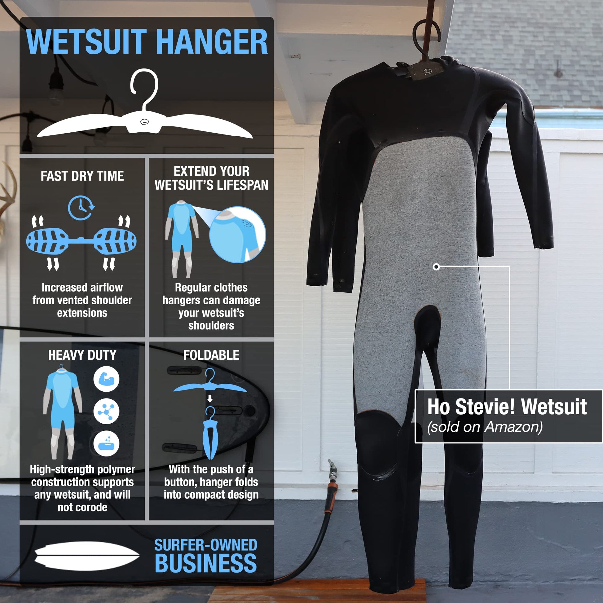 • EXTEND YOUR WETSUIT’S LIFESPAN - (did you know Ho Stevie! Wetsuits are available on Amazon now?) Regular clothes hangers can damage your wetsuit’s shoulders (and might not even support your heavy wet suit). Use this hanger to hang your wetsuit in the shade, out of the harmful UV sunlight, while still drying fast because of the broad vented shoulders.