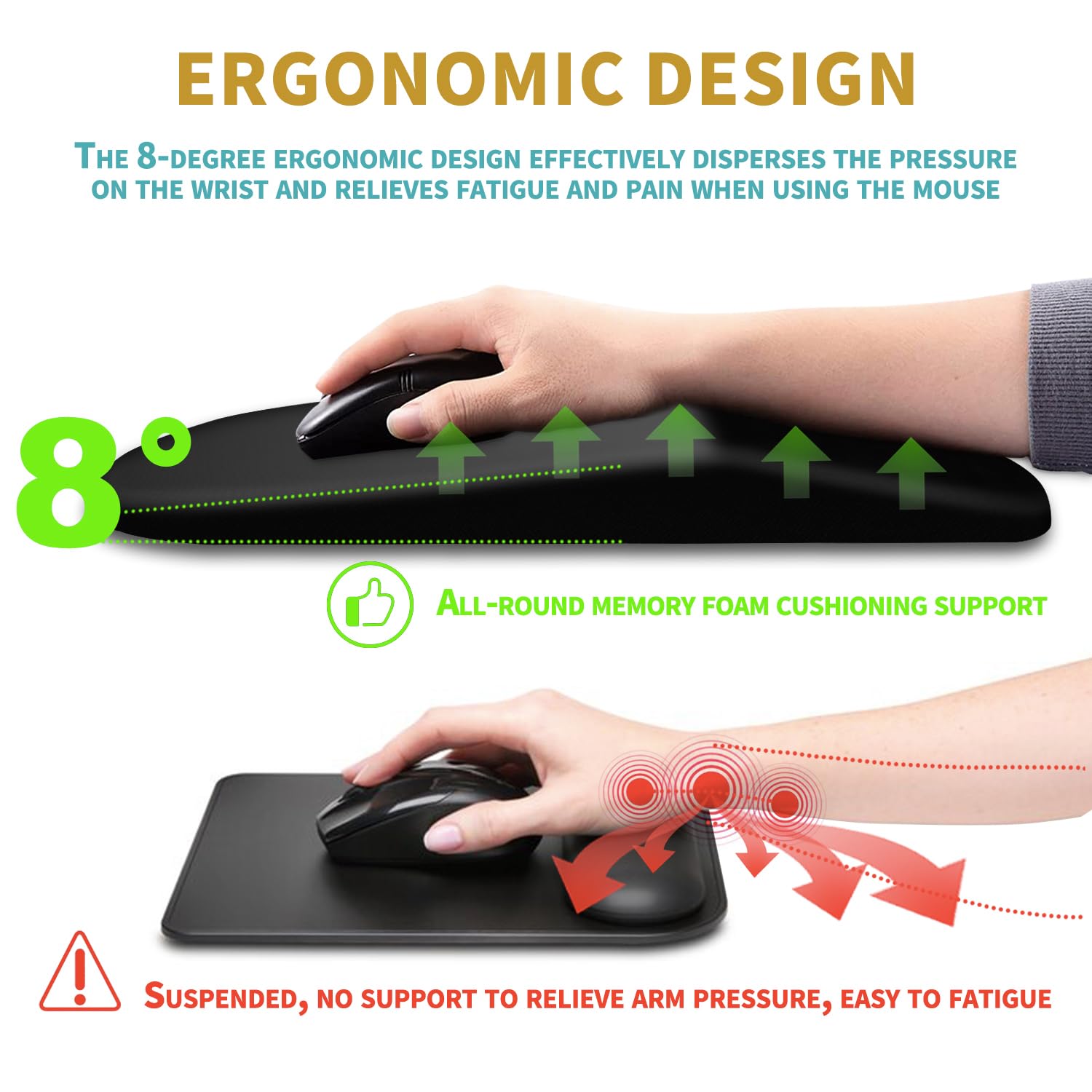 • 【Ergonomic Massage Design】The innovative ergonomic 8-degree slope and massage bump design perfectly support the wrist and palm. Massage bump design can effectively relieve wrist pain and fatigue, improve carpal tunnel syndrome (CTS), strengthen the air circulation between wrist and mouse pad, prevent sweating, and keep your wrist in the most comfortable state.