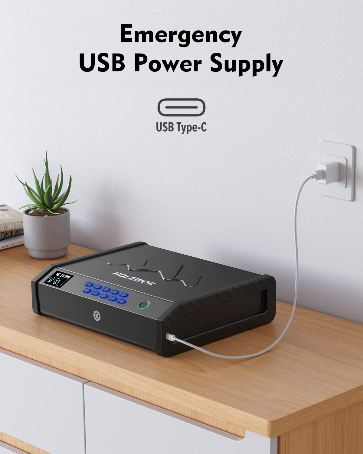 HOLEWOR Gun Safe, Biometric Gun Safes for Pistols with LCD Display of Temperature Humidity, Fingerprint Quick Access Pistol Safe Solid Handgun Safe with USB C Port