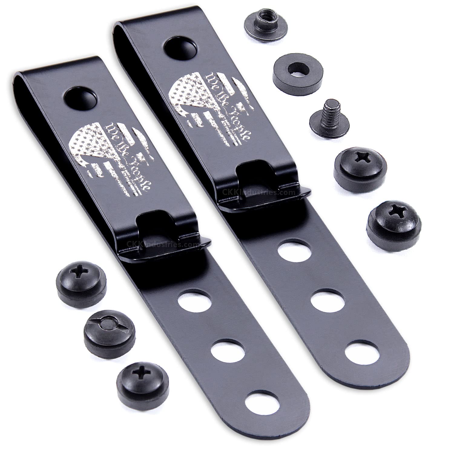 HolsterSmith Universal Metal Belt Clip for Holster Making - (Model 5) - (3-Hole) - (Tactical Black) - (w/Punisher Skull - We The People Engraving) - (w/Mounting Hardware) - (2 Pack)