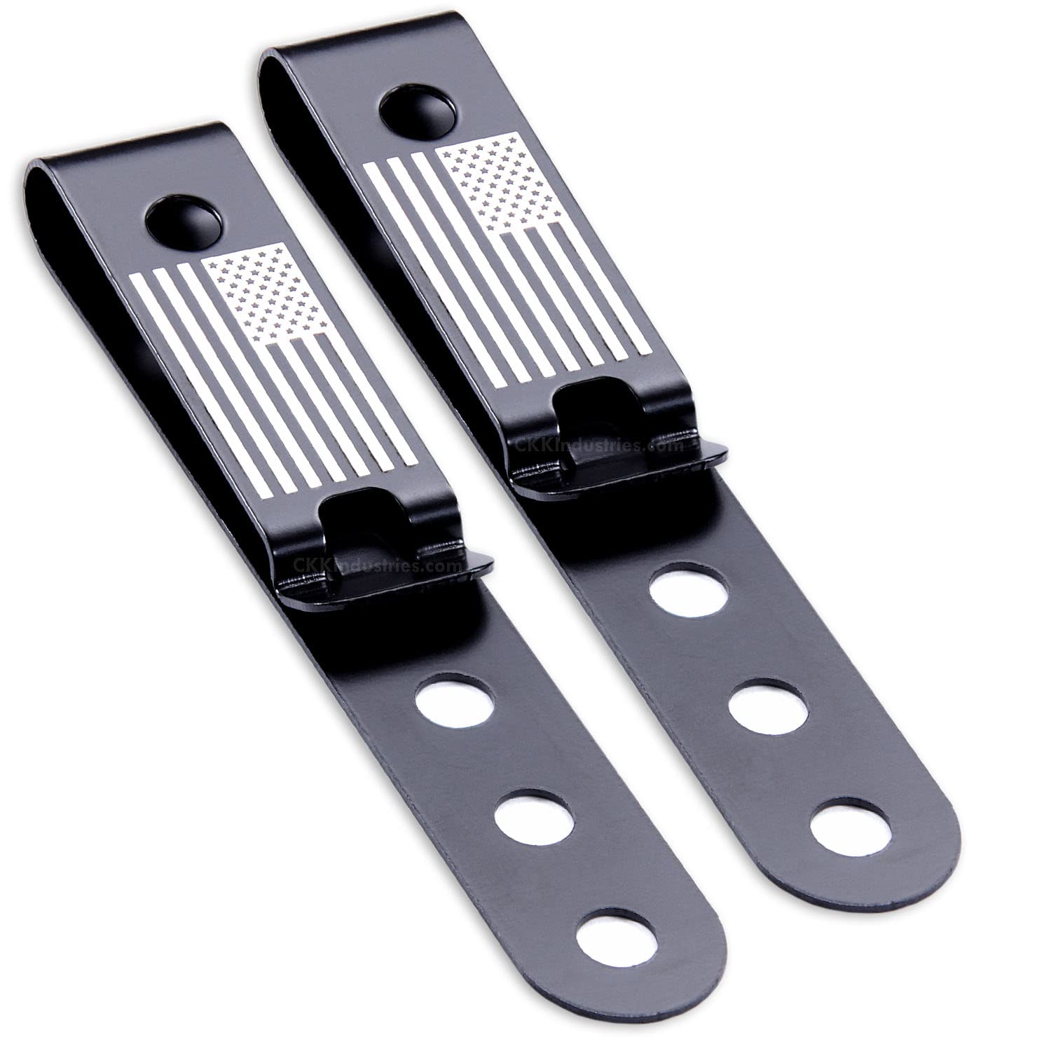 HolsterSmith Universal Metal Belt Clip for Holster Making - (Model 5) - (3-Hole) - (Tactical Black) - (w/USA Flag Engraving) - (2 Pack)
