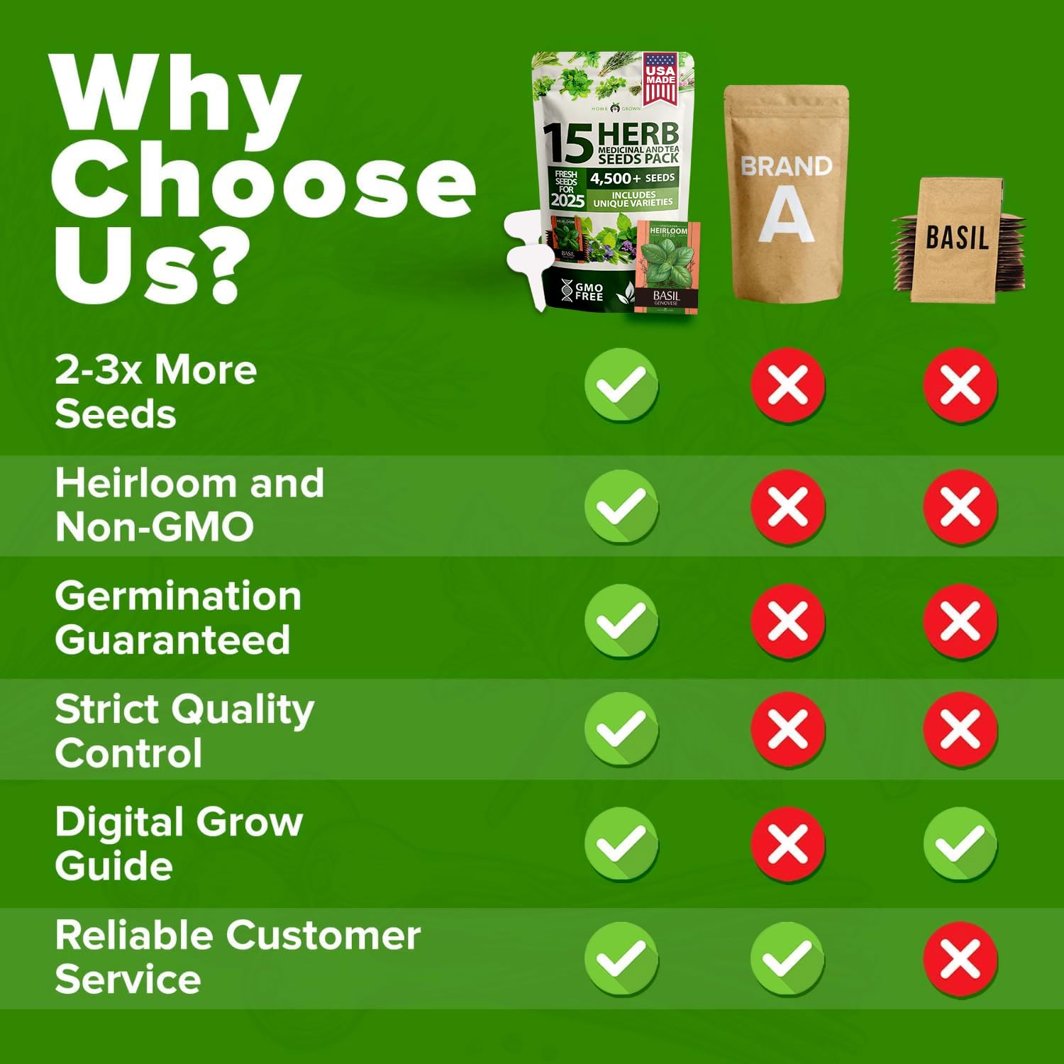 • High-Quality, Non-GMO & Heirloom Herb Seeds: This selection features 4,500+ seeds from 15 heirloom herb varieties that are completely non-GMO.These herb seeds are perfect for those seeking a sustainable, eco-conscious way to grow herbs indoors or in backyard garden beds. With high germination rates, they provide dependable results whether grown hydroponically or in soil. Ideal for those searching for the best herbs to grow indoors or outdoors with long-lasting yields season after season.